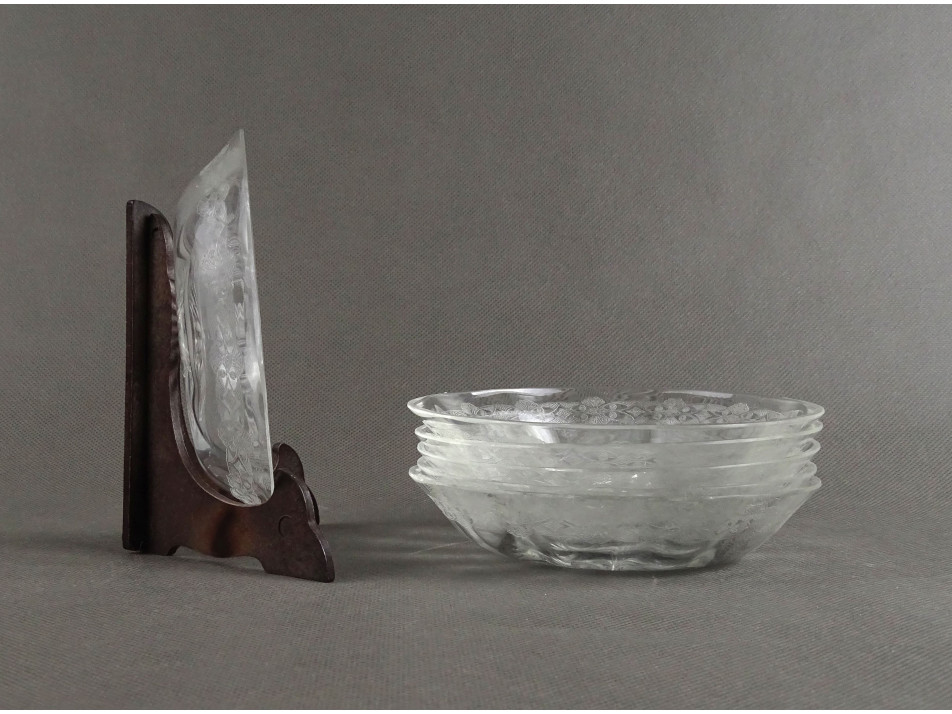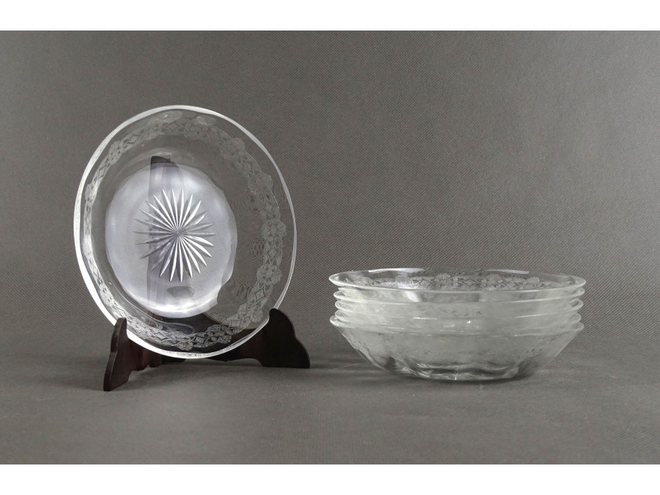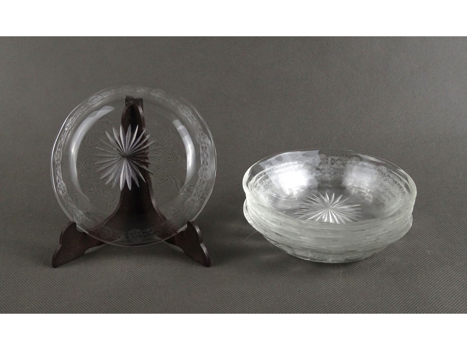 Antik hibátlan állapotú maratott és csiszolt üveg süteményes tányér készlet 6 darab