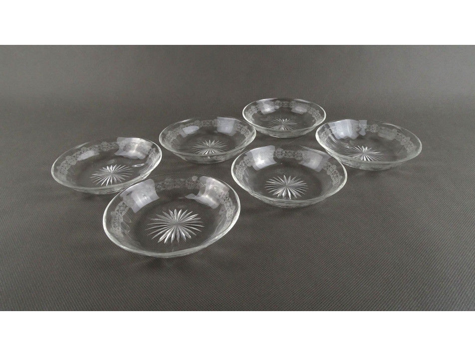 Hibátlan állapotú, 6 darabos üveg süteményes tányér készlet az oldalán maratott a talpán csiszolt díszítéssel.