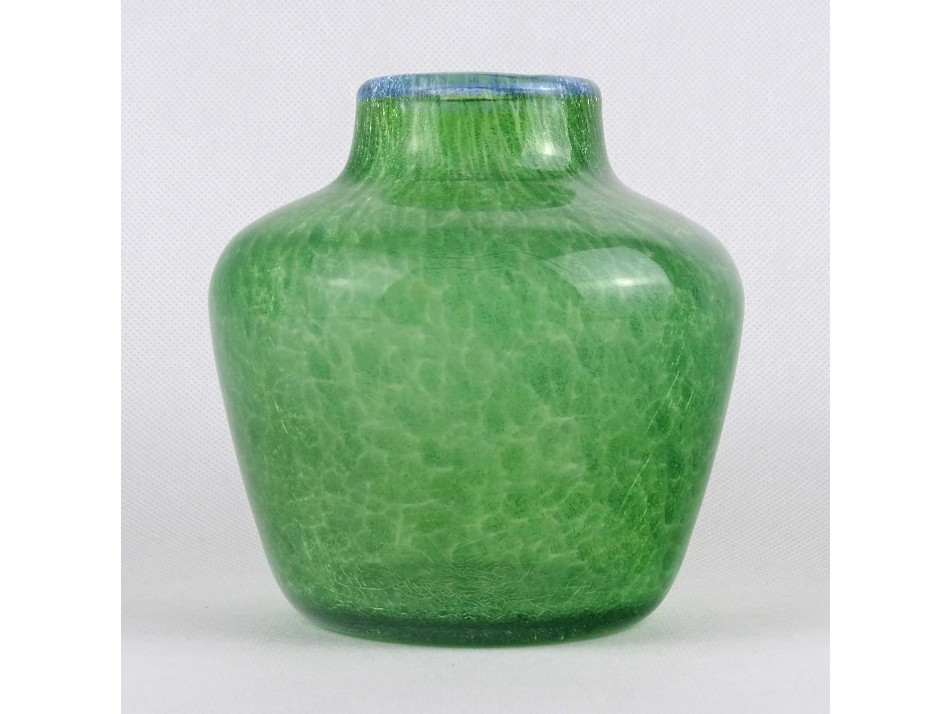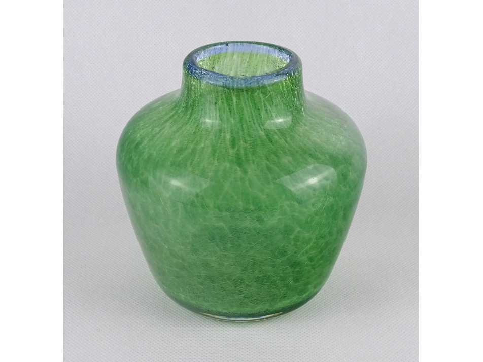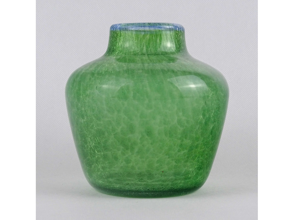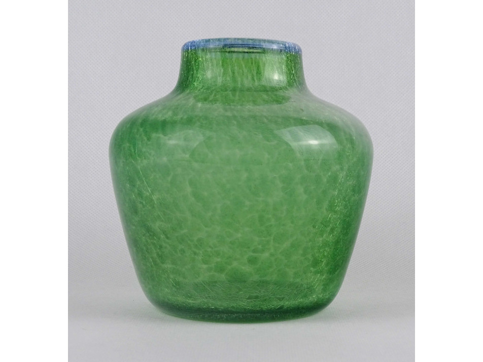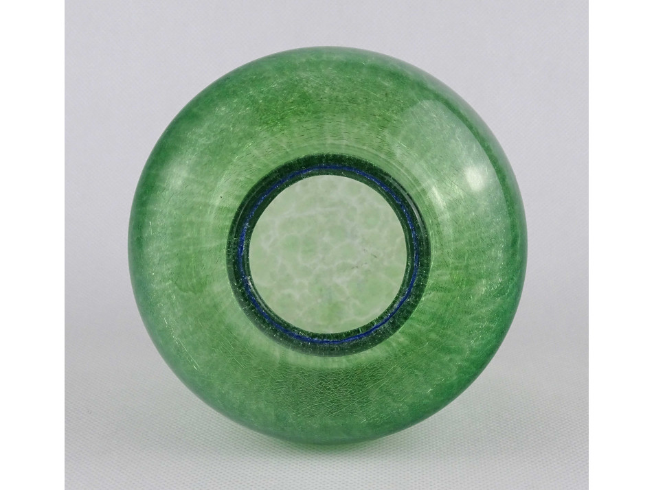 Hibátlan állapotú, különleges irizáló hatású, zöld és kék színű művészi karcagi fátyolüveg váza, díszváza.