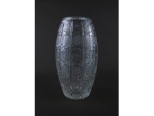 Régi, szép állapotú, vastagfalú, szabályos síklapokból álló, nyolcszögletű, füstszínű üveg design váza, díszváza. A váza felső peremén kívülről egy apró lepattanás látható.
