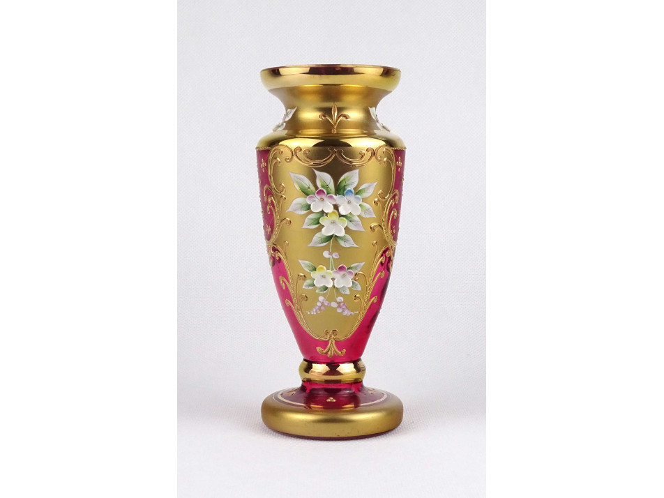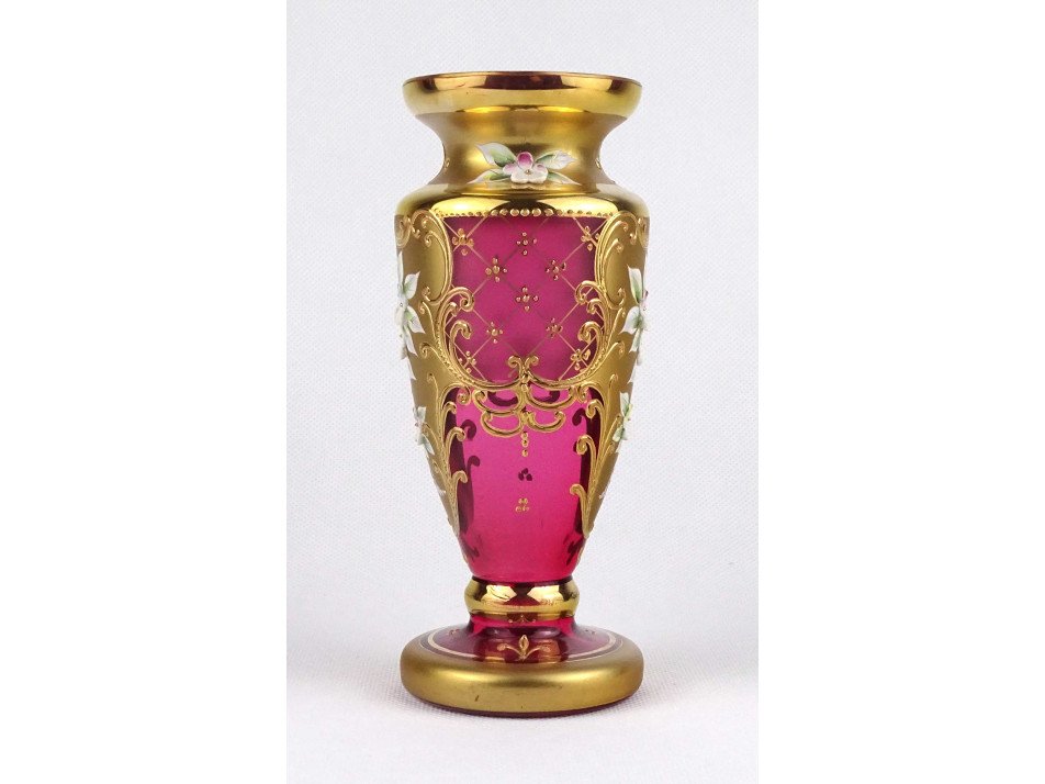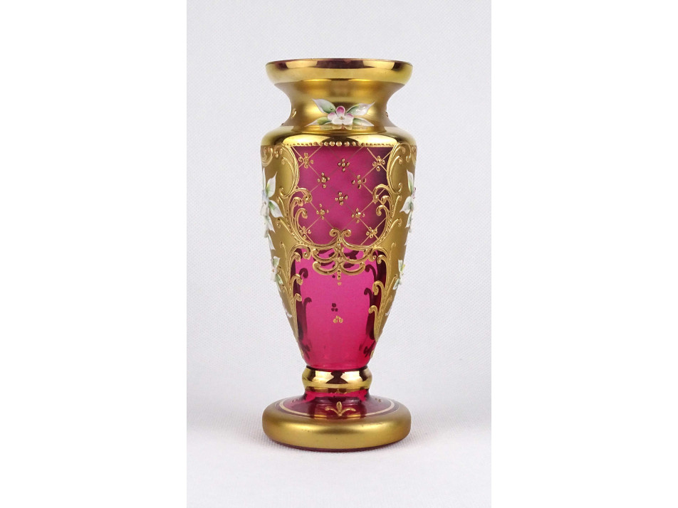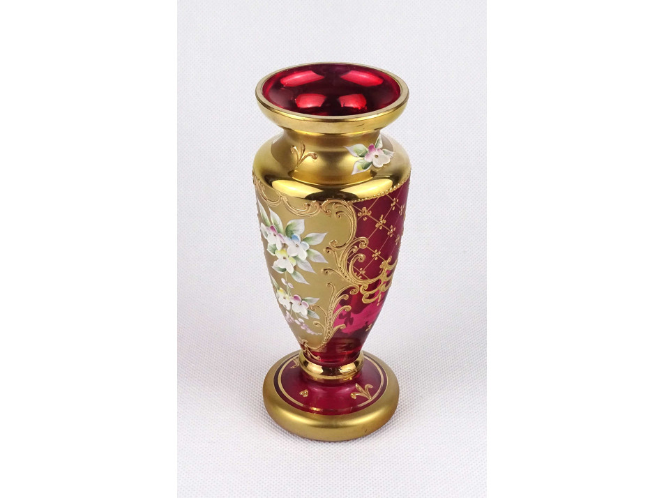 Hibátlan állapotú, talpas, bordó színű, dúsan aranyozott, domború virágmintás Bohémia üveg díszváza, rajta plasztikus virág mintákkal.