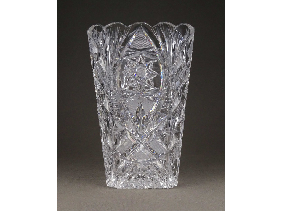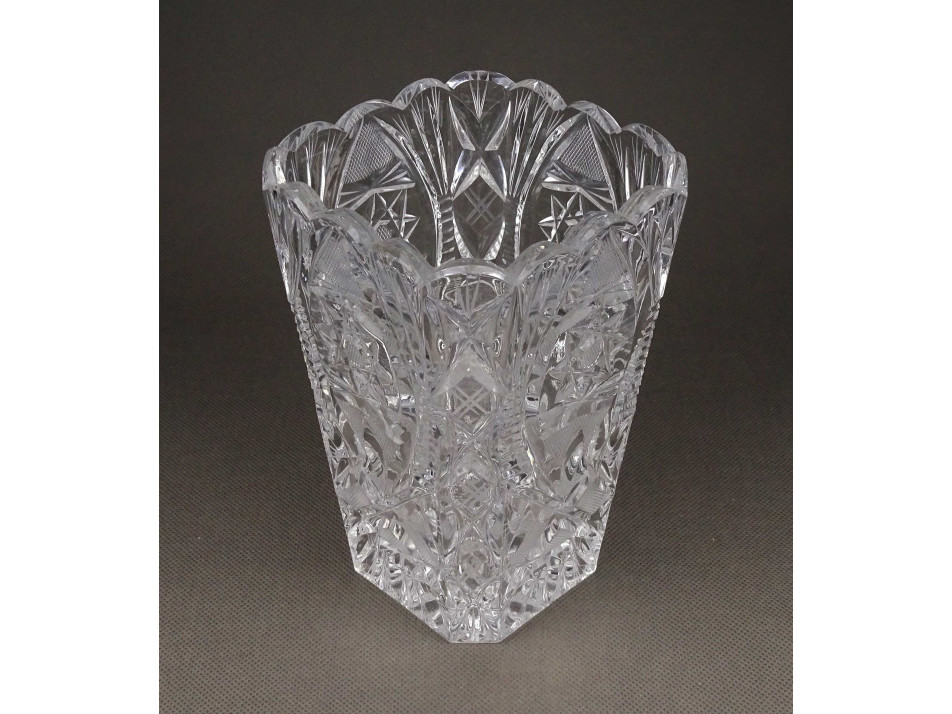 Hibátlan állapotú, gazdagon díszített, szögletes alakú, csiszolt kristályváza, virágváza, díszváza.