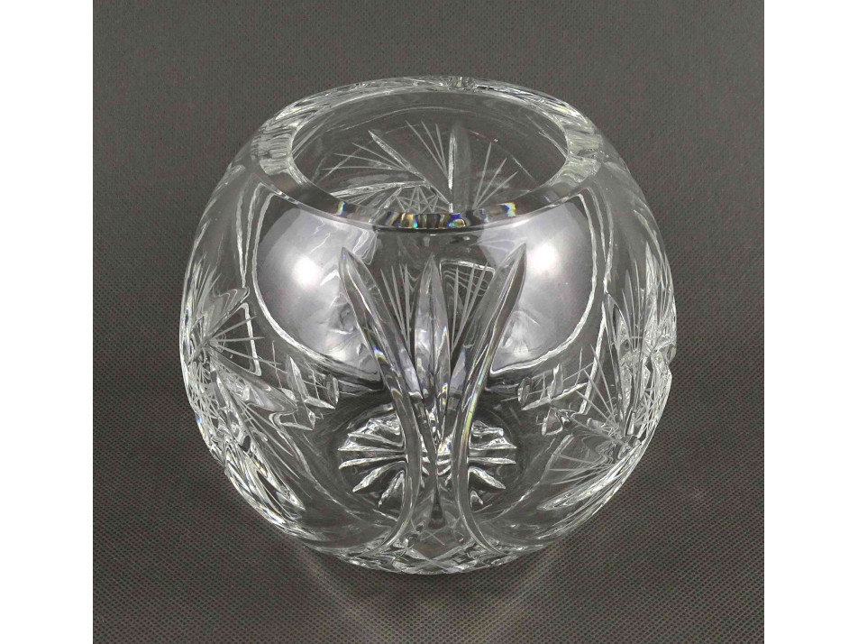 Hibátlan állapotú, vastagfalú, csiszolatokkal díszített, gömb alakú kristály váza, díszváza.