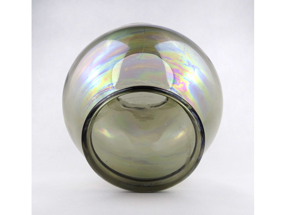 Nagyméretű, szép állapotú, irizáló, füst színű fújtüveg díszváza, design váza. Gömbszerűen öblös, belülről bordázott művészi üveg váza.