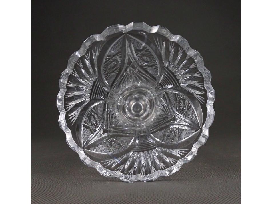Régi, hibátlan állapotú, oldalán csiszolatokkal díszített talpas kristályváza, díszváza.