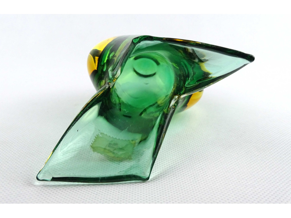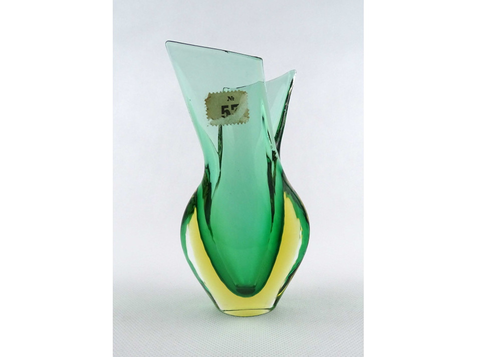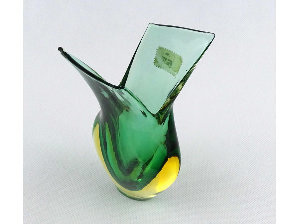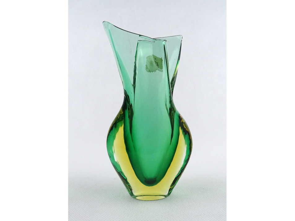 Hibátlan állapotú, vastag falú, zöld színű, művészi, cseh fújt üveg sommerso váza XX. század második feléből. Nyakán kereskedői etikett címke töredék.