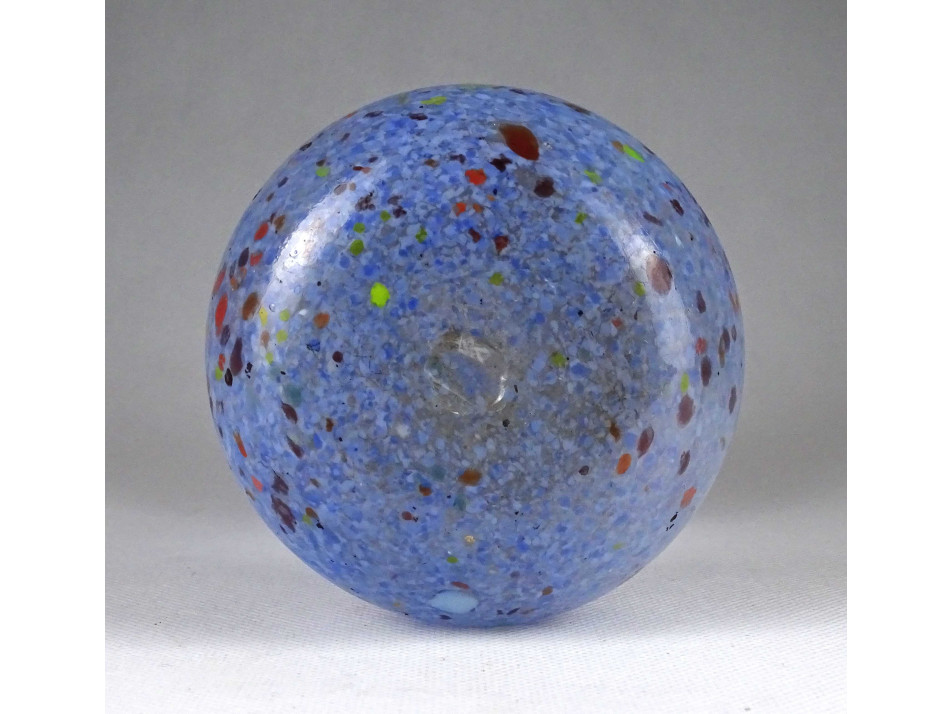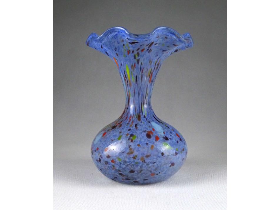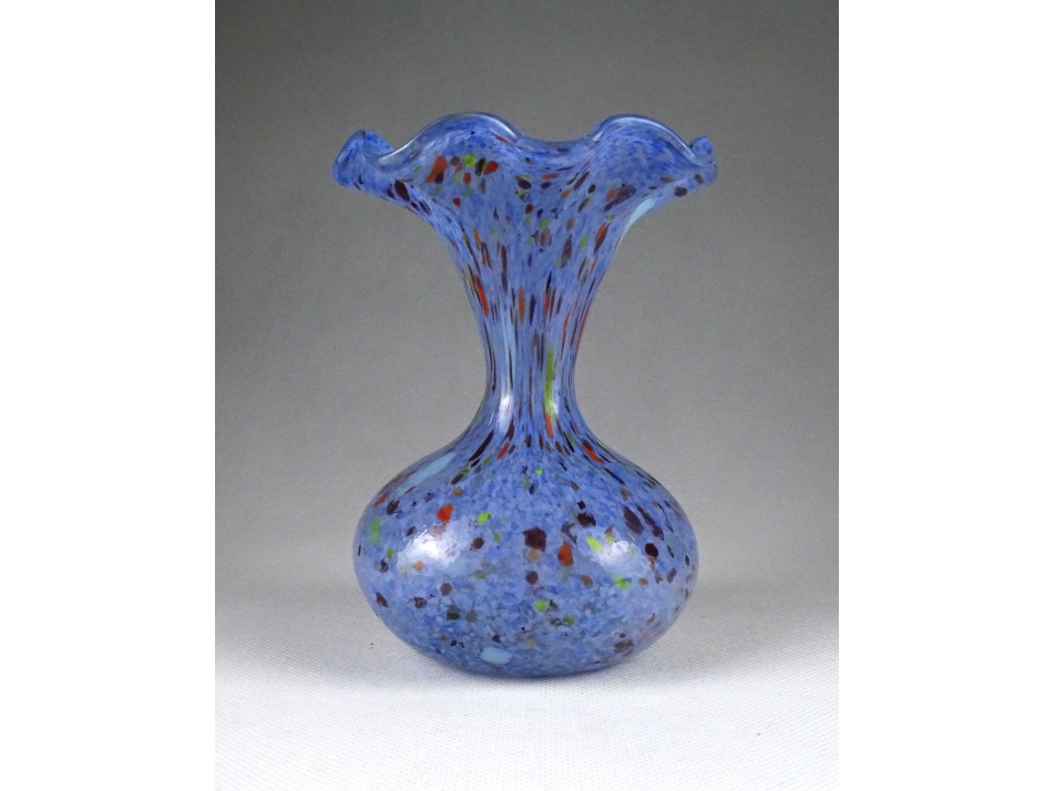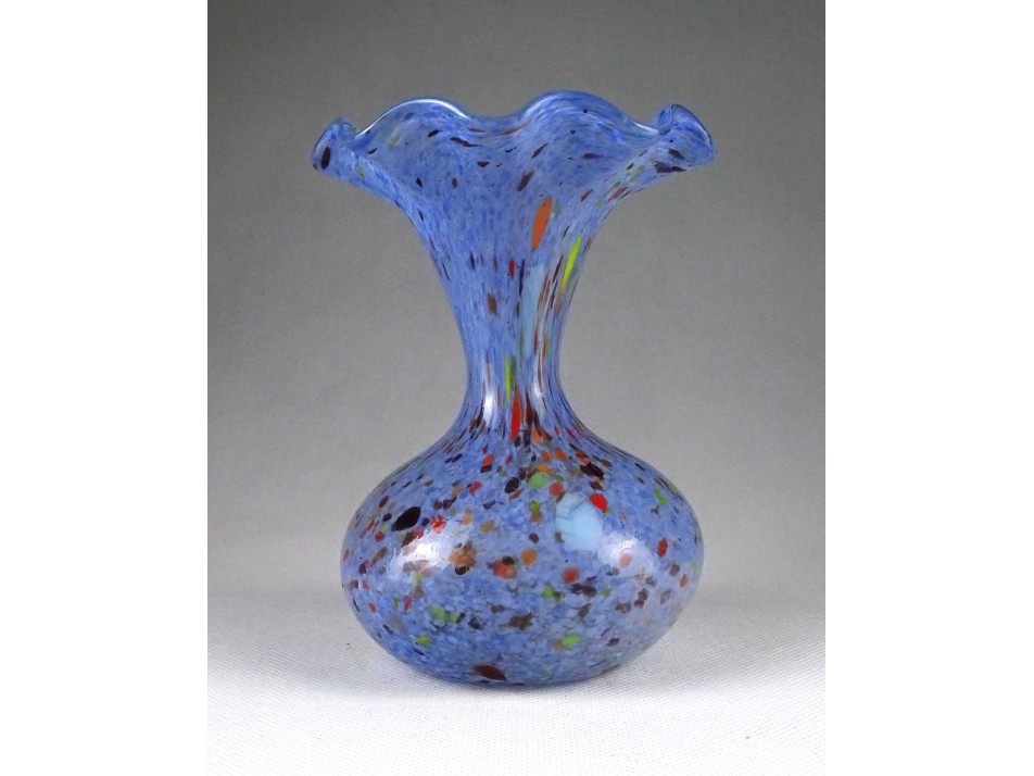 Régi, hibátlan állapotú, több színű, anyagában színezett, öblös testű, fodros szájú fújtüveg szálváza, virágváza. Alap színe a világos kék, emellett narancs, vörös, lila és fehér színekben játszik. Alján látható a fújás és szakítás nyoma.
