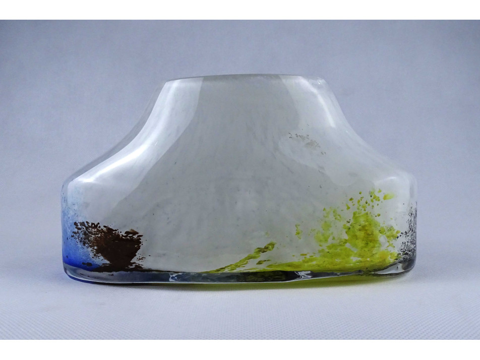 Hibátlan állapotú, anyagában színezett, fehér - sárga - kék, művészi rétegelt üveg váza. Öblös testű fújtüveg design váza, díszváza.