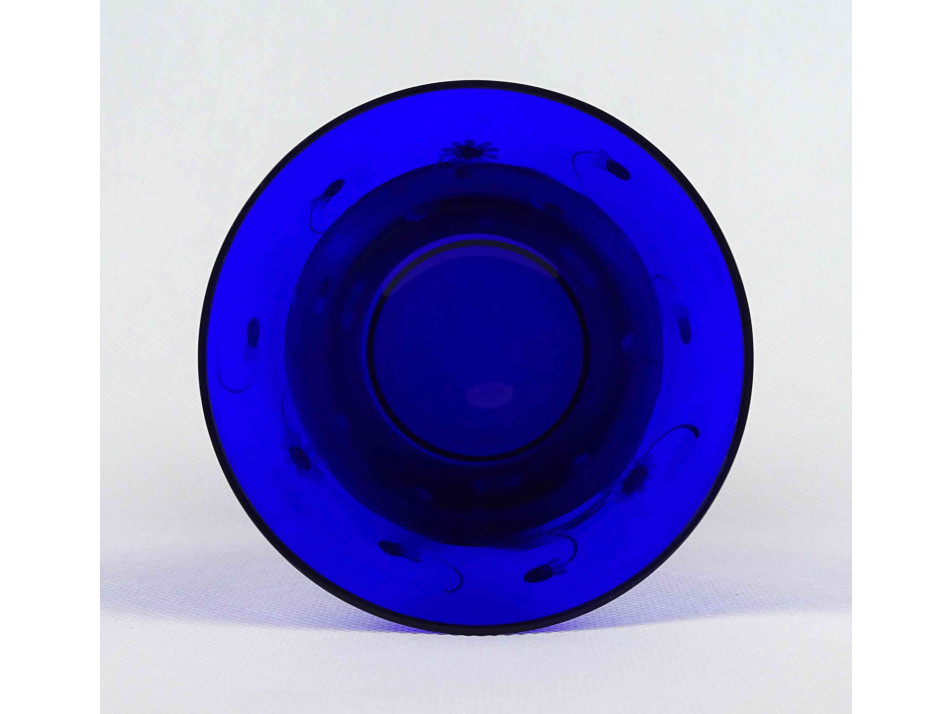Gyönyörű kobaltkék, királykék színű, apró virágokkal díszített, kézzel festett parádi üveg váza, díszváza.