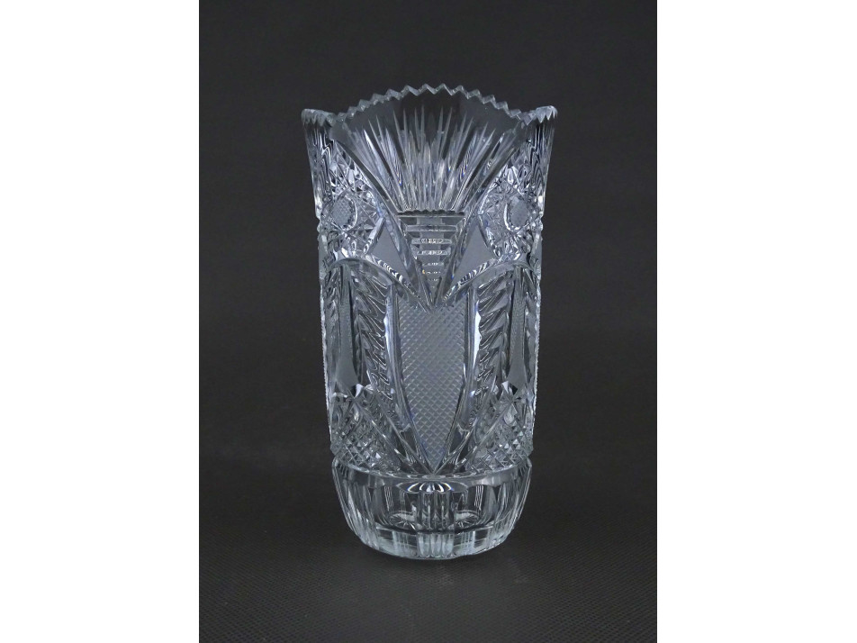 Régi, hibátlan állapotú, gyönyörű, csiszolatokkal gazdagon díszített, kisméretű kristály váza, díszváza, virágváza.