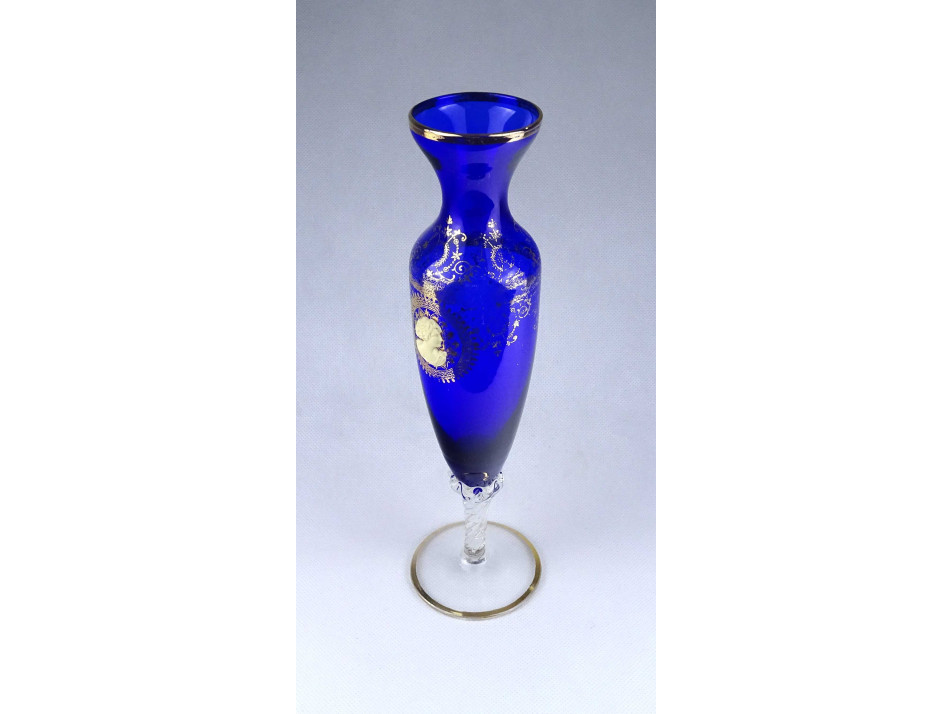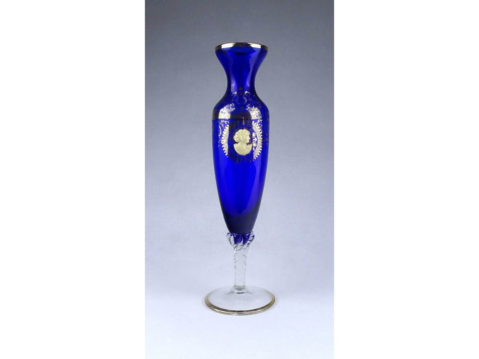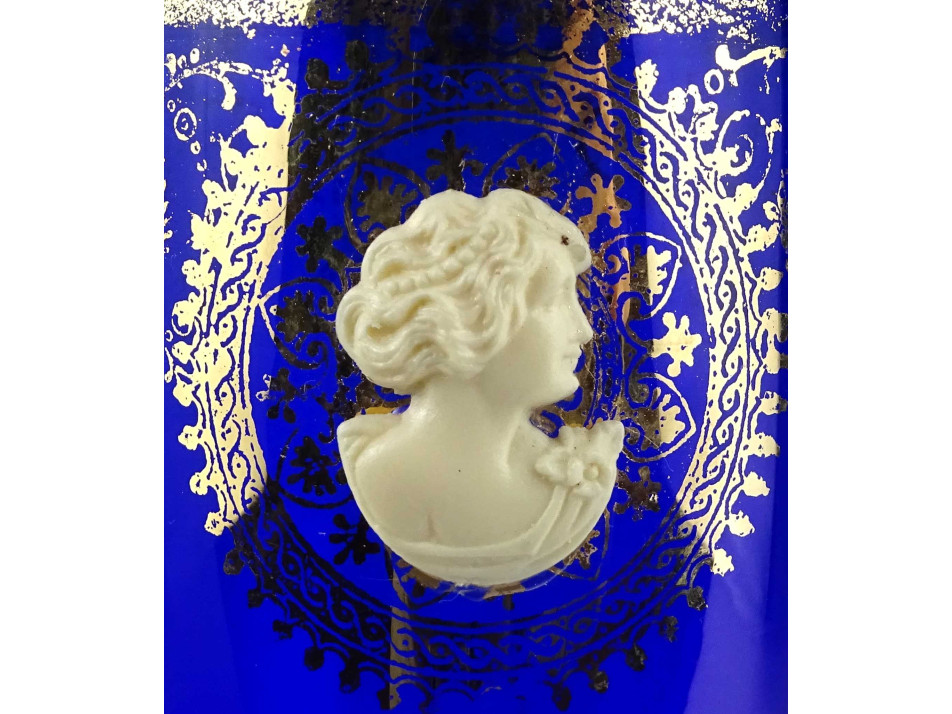 Gyönyörű kobaltkék színű, aranyozott, antik motívumokkal és csont hatású domborműves női portré rátéttel díszített, fújt üveg váza, díszváza. Aranyozása kopottas.