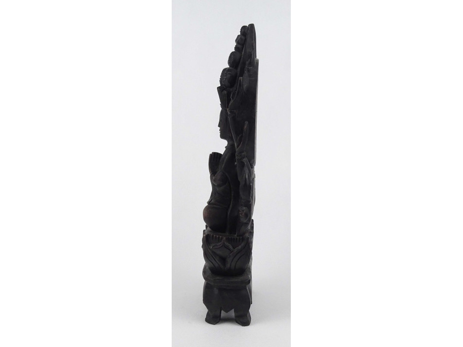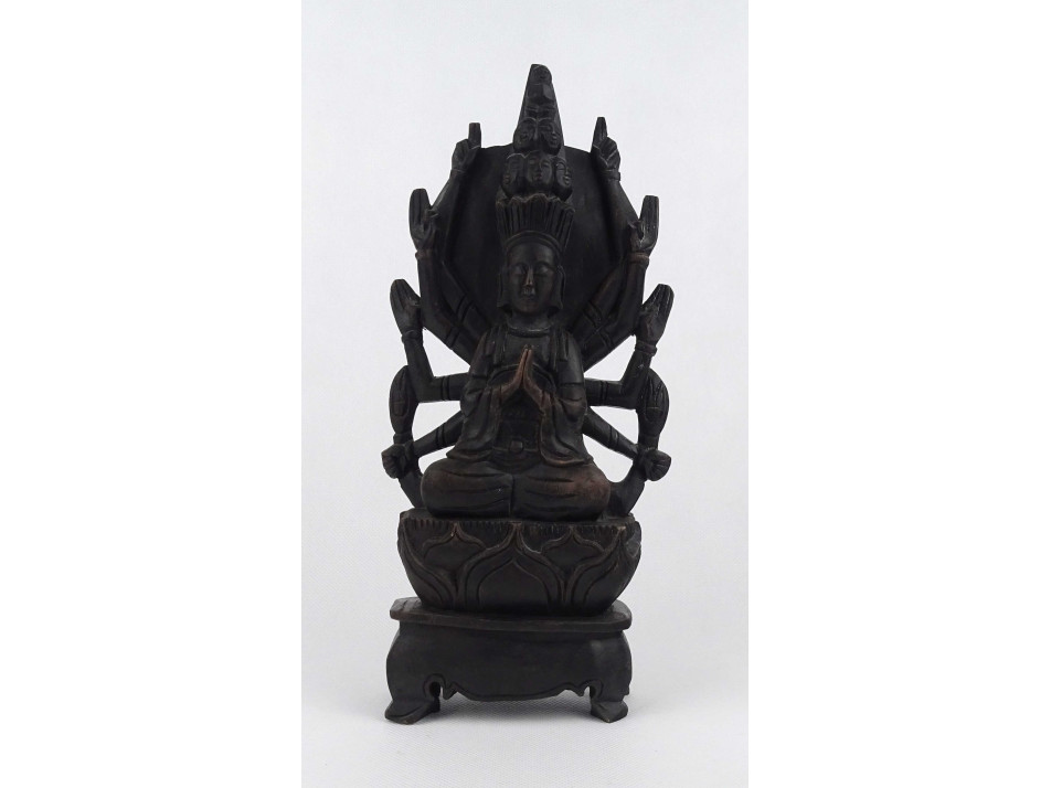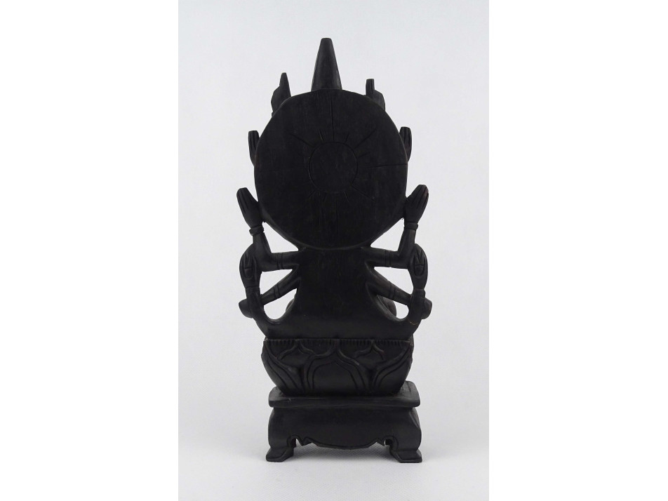 Szép állapotú, egzotikus keményfából faragott, távol-keleti, buddhista istenség Bráhma szobor, lótusz ülésban meditáló nyolckarú, sokfejű istenalak.