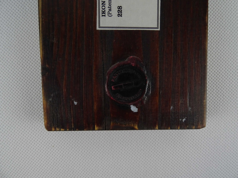 Hibátlan állapotú, antik ikon másolata fatáblán, falra akasztási lehetőséggel. Hátoldalán hitelesítő viaszpecsét és papírcímke látható.
