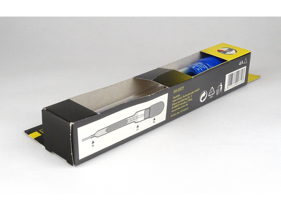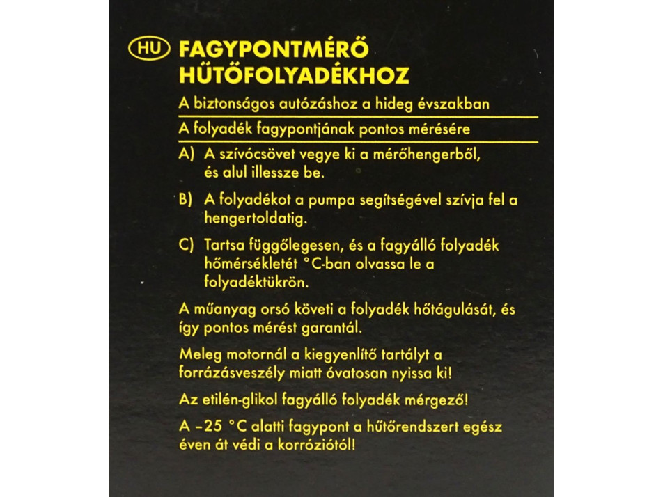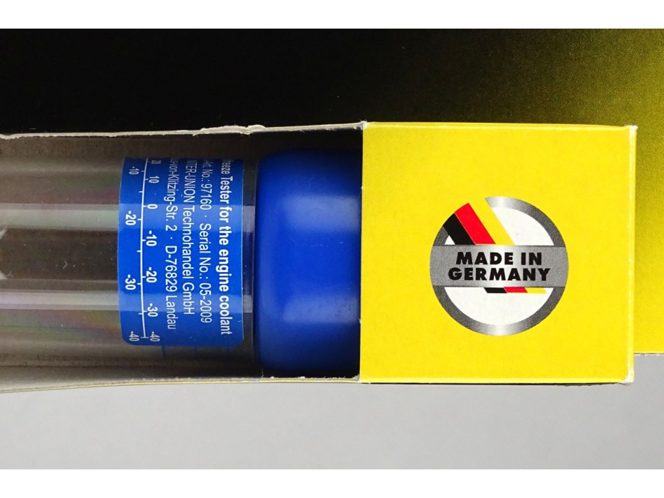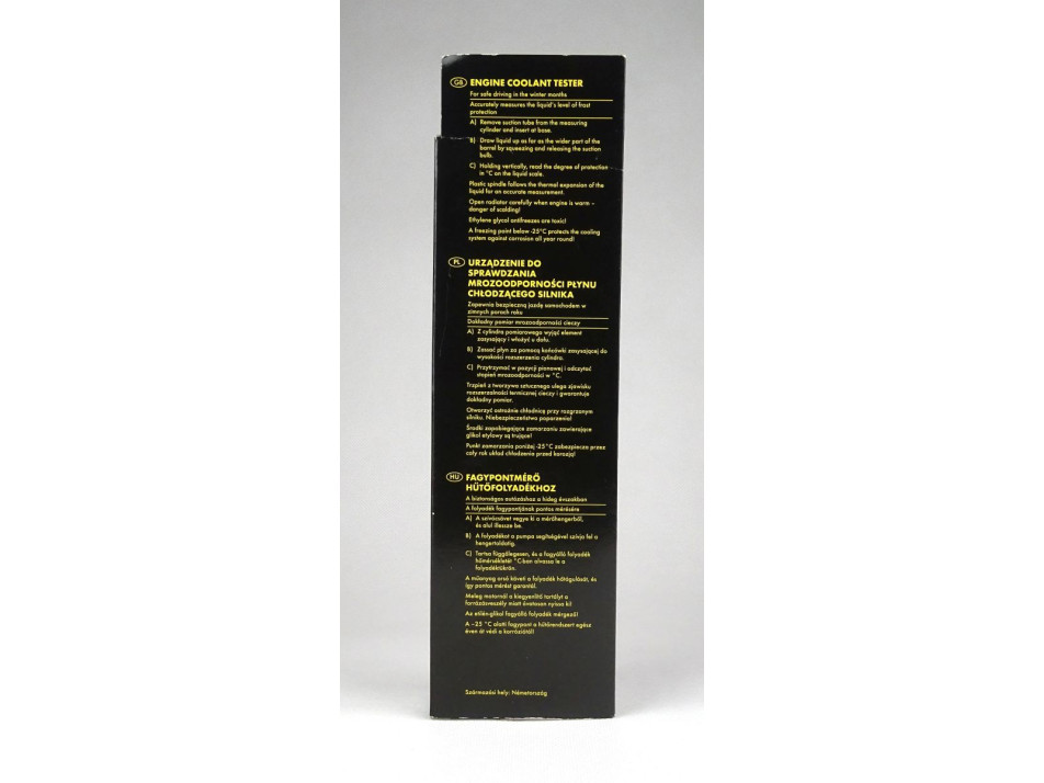 Eredeti dobozában található, német gyártmányú, egyszerű, otthoni használatra szánt gépjármű hűtőfolyadék fagypont kalibráló eszköz. A csomagolás hátoldalán a magyar nyelvű használati útmutatója megtalálható. Többször használható!