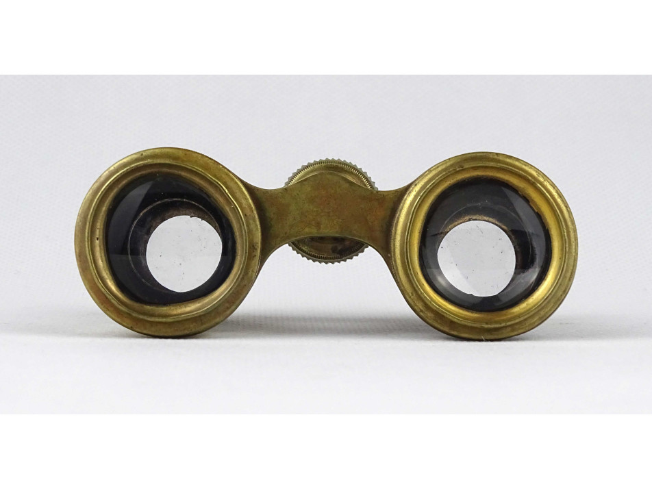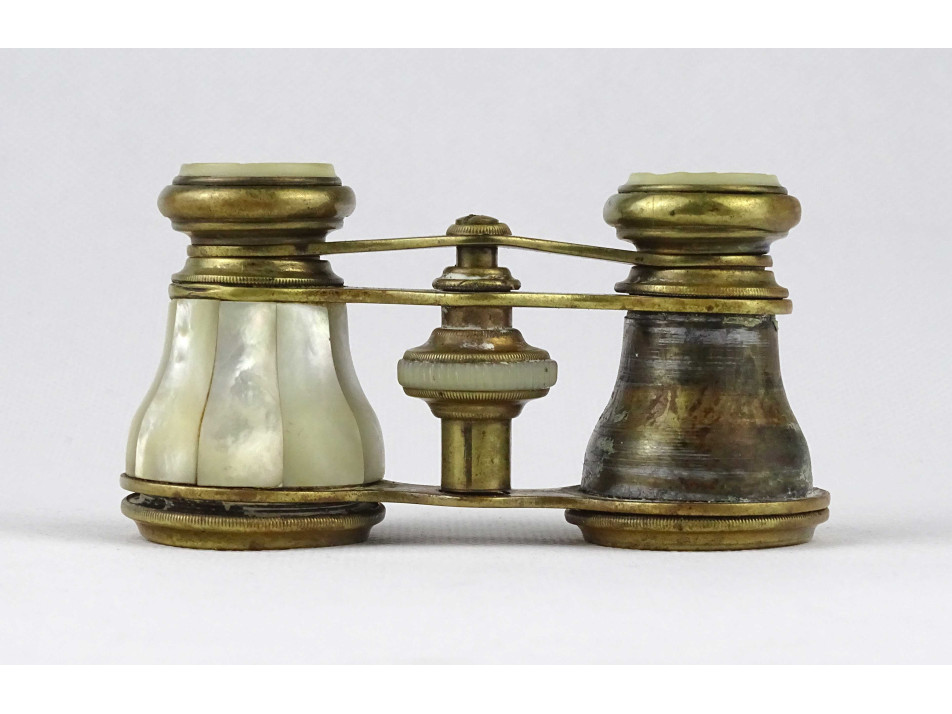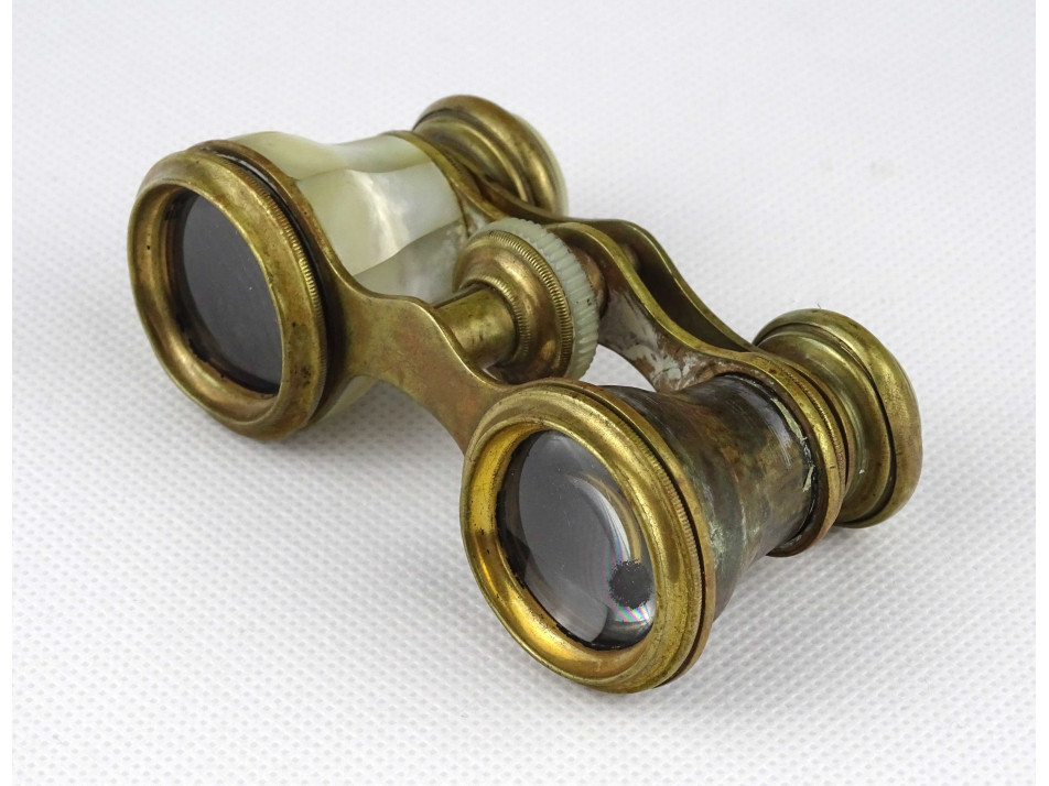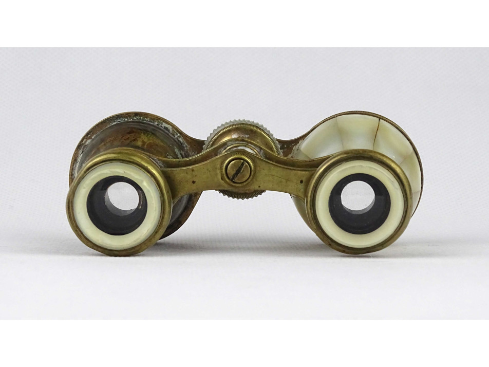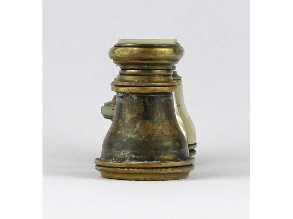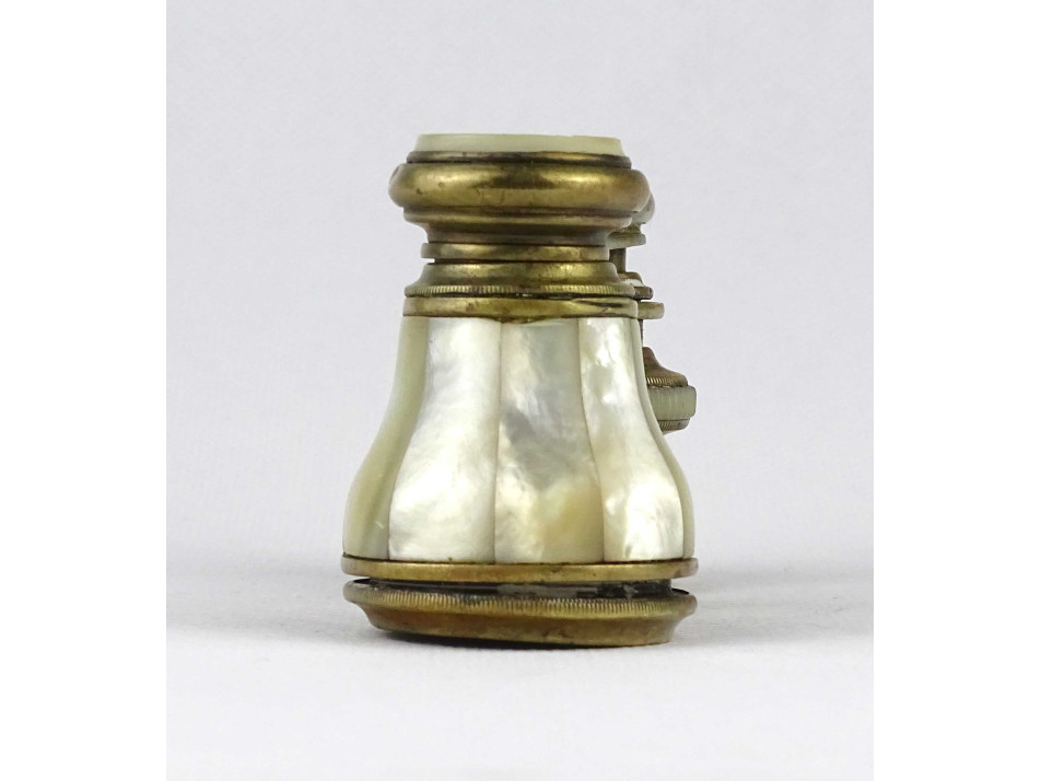 Nagyon régi, szép állapotú, réz testű színházi távcső, látcső, kukker, csiszolt kagyló, gyöngyház berakással. Az egyik csövéről hiányzik a gyöngyház.
