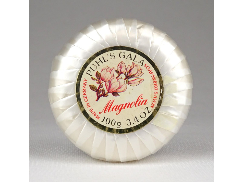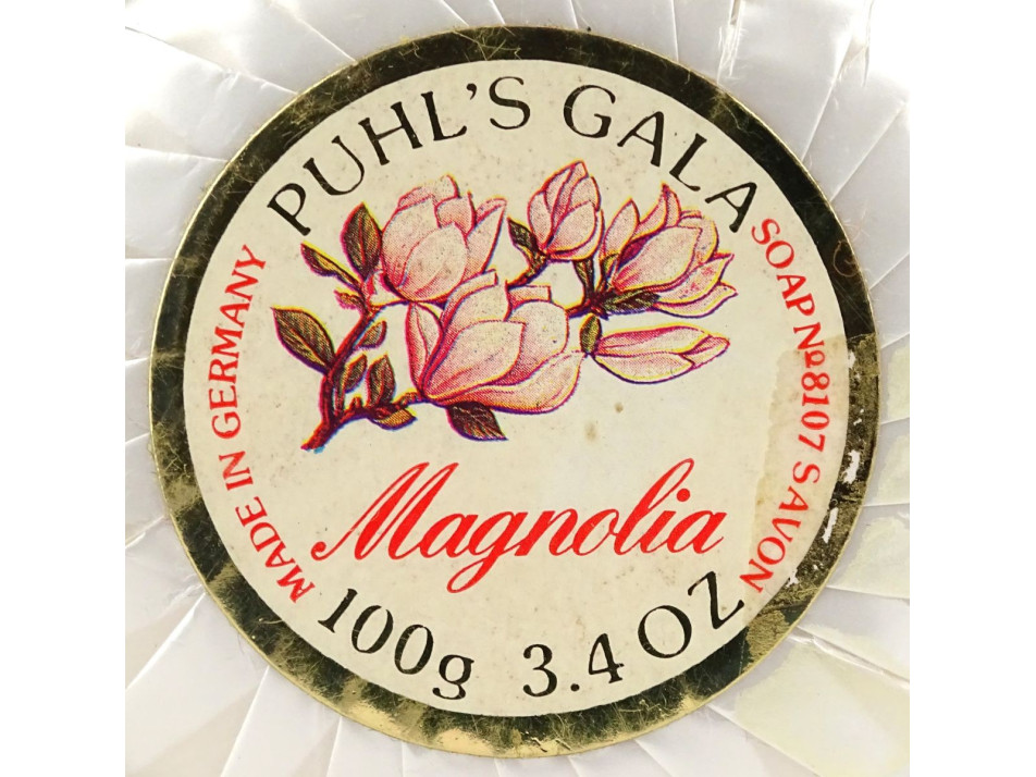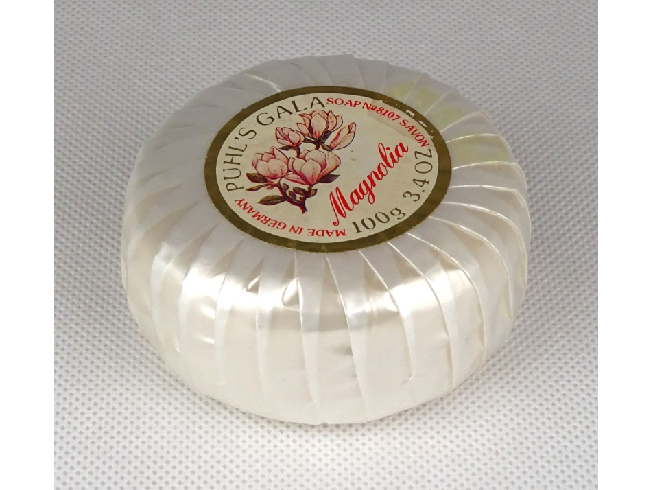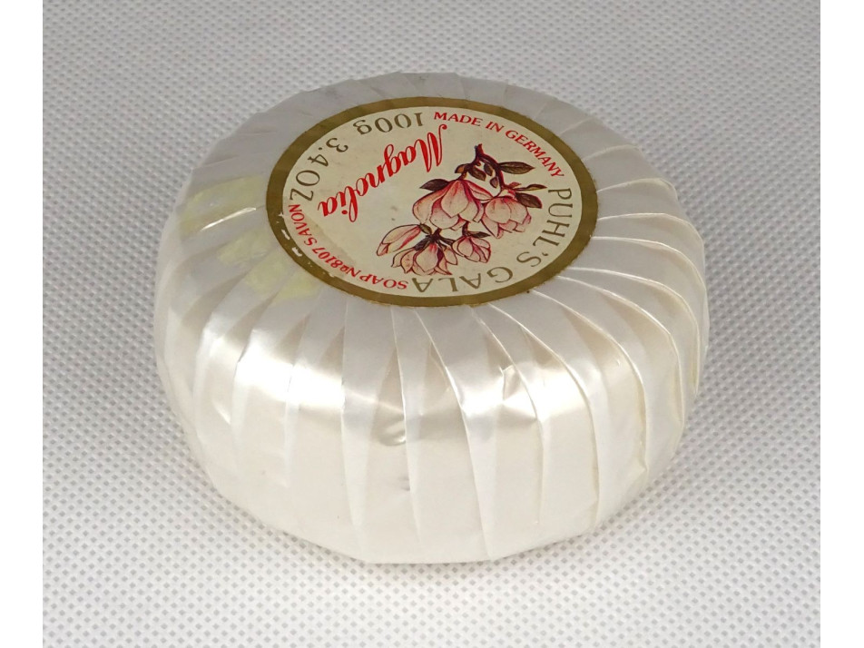 Régi bontatlan szappan. Márkás, magnólia illatú minőségi német szappan. Feliratok: PUHL'S GALA MAGNOLIA MADE IN GERMANY SOAP No 8107 SAVON 100G 3.4 OZ