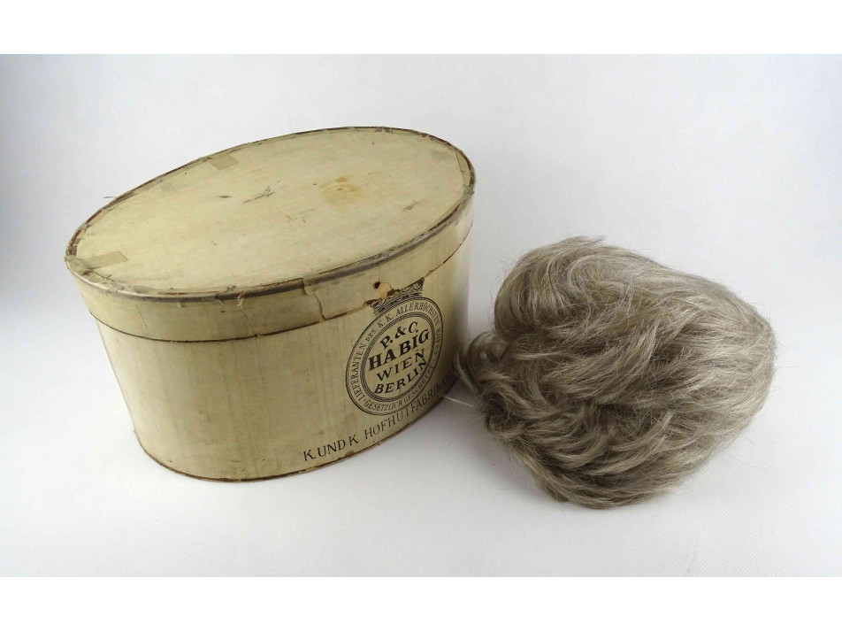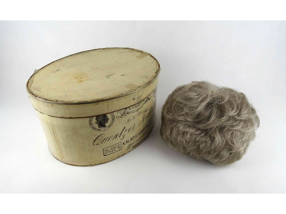Hibátlan állapotú, tisztán tartott, márkás minőségi paróka, póthaj. Rövid, ősz női fazon. A parókához egy szép állapotban megmaradt ovális papírdoboz, kalapdoboz tároló tartozik.