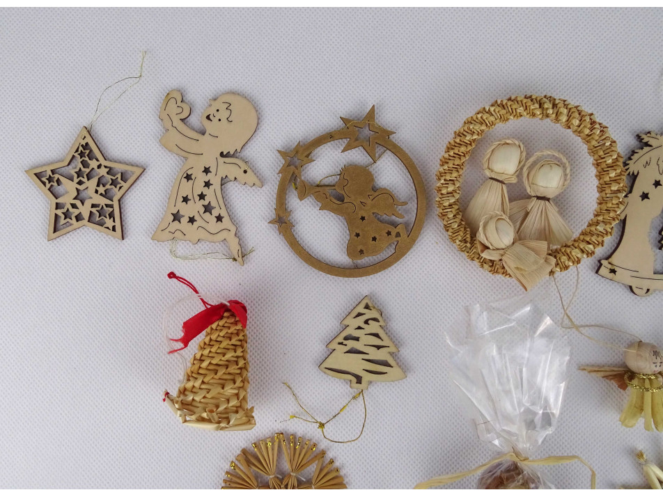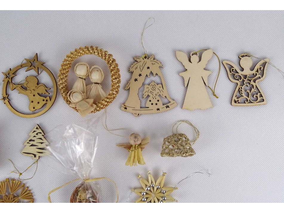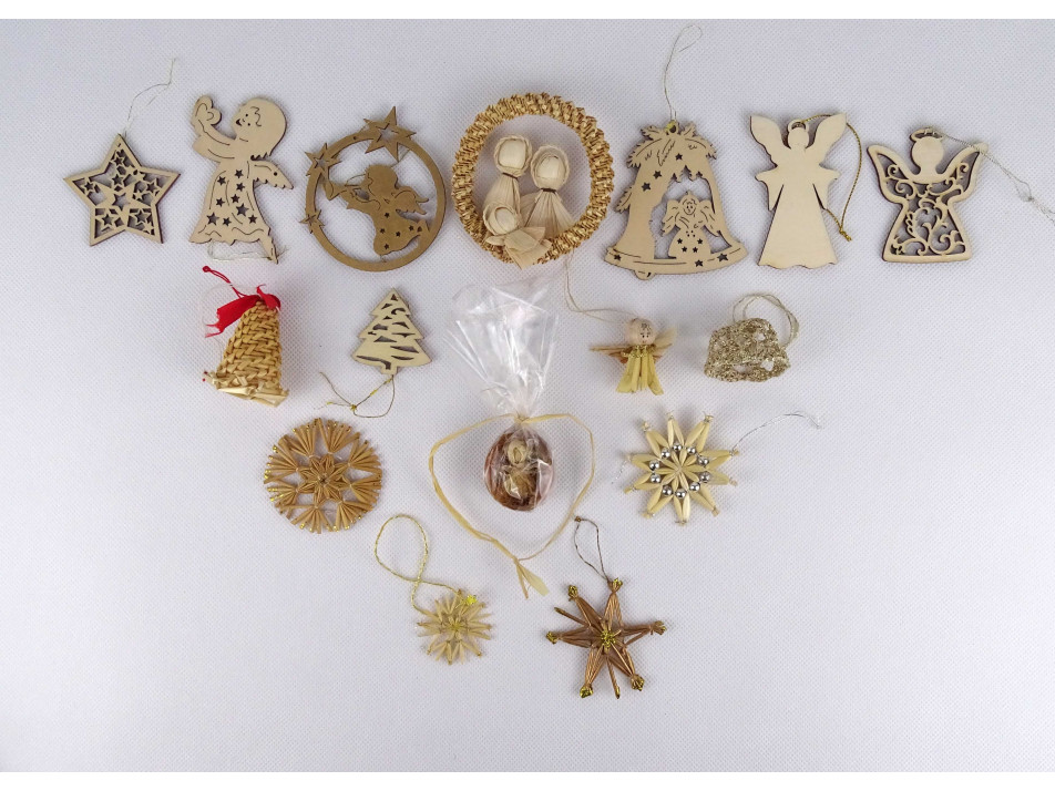 Régi, szép állapotú, szalmából font és fából készült karácsonyfadísz csomag, 16 darab egyben. Kézimunkával készült díszek, van köztük angyal, hópehely, harang, csillag és karácsonyfa alakú is.