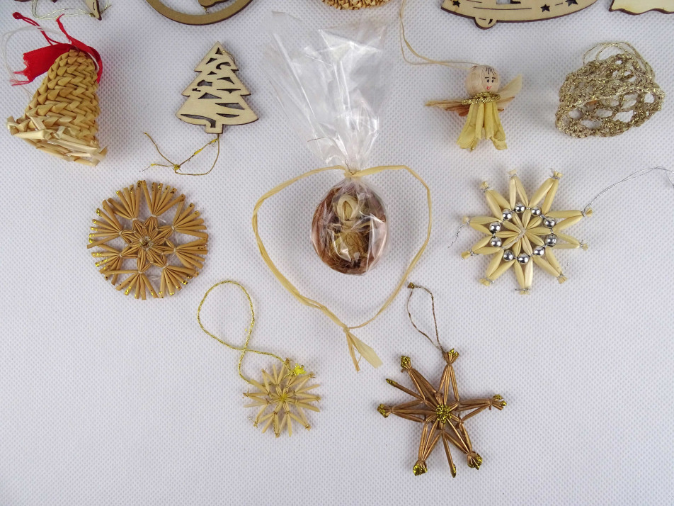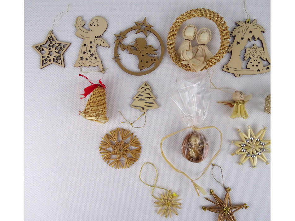 Régi fából és szalmából készült karácsonyfadísz csomag 16 darab