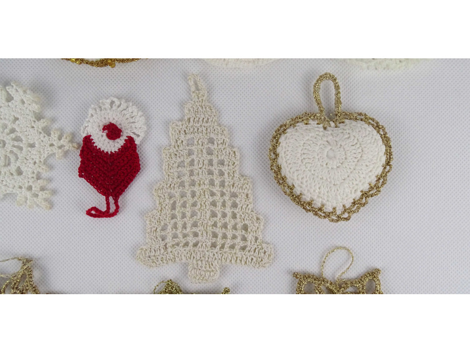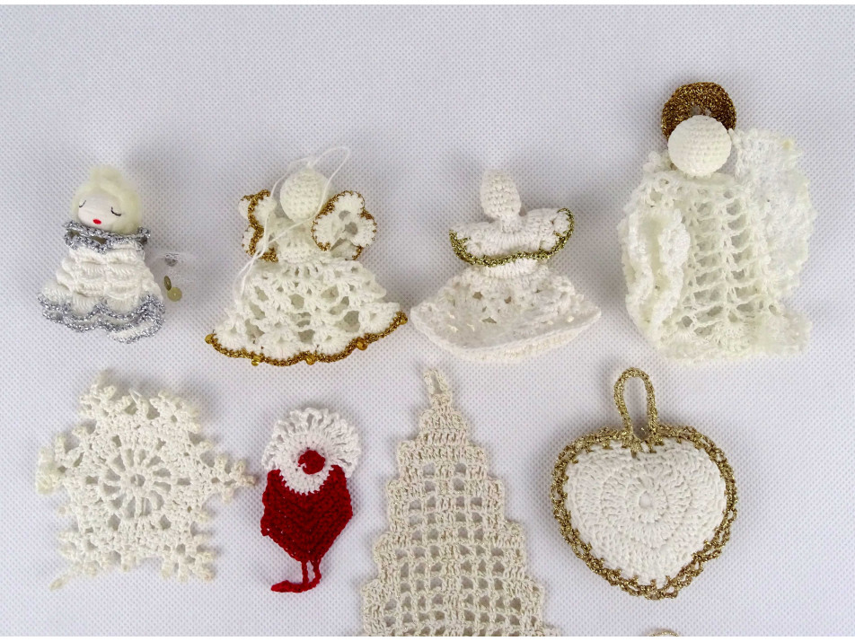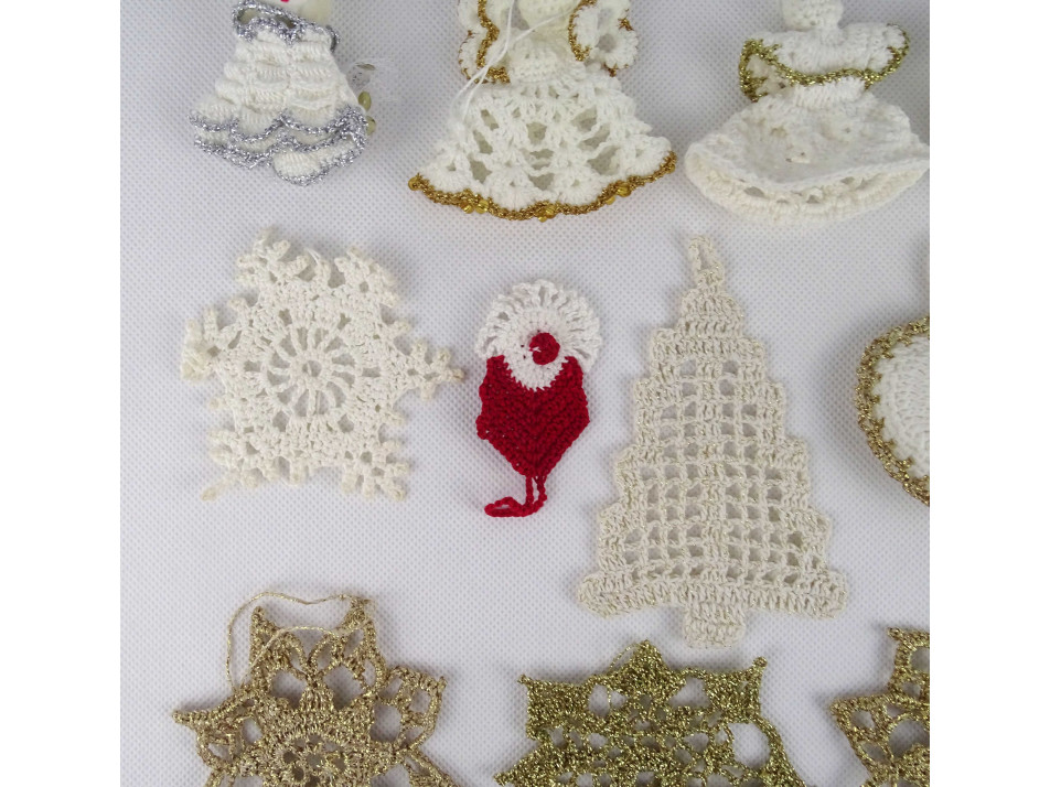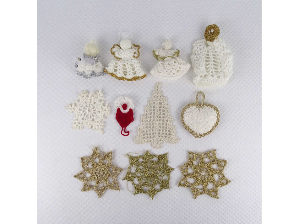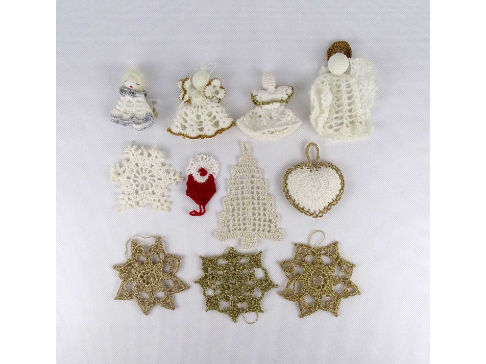 Régi, szép állapotú, horgolt csipke karácsonyfadísz csomag, 11 darab egyben. Kézimunkával készült díszek, van köztük angyal, hópehely, mikulás, szív és karácsonyfa alakú is.