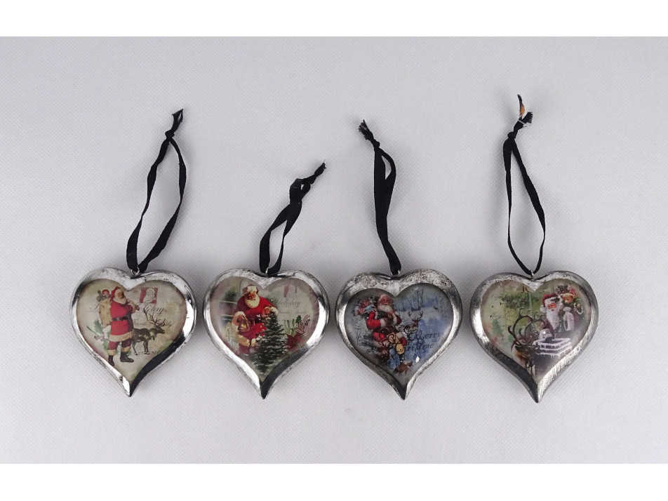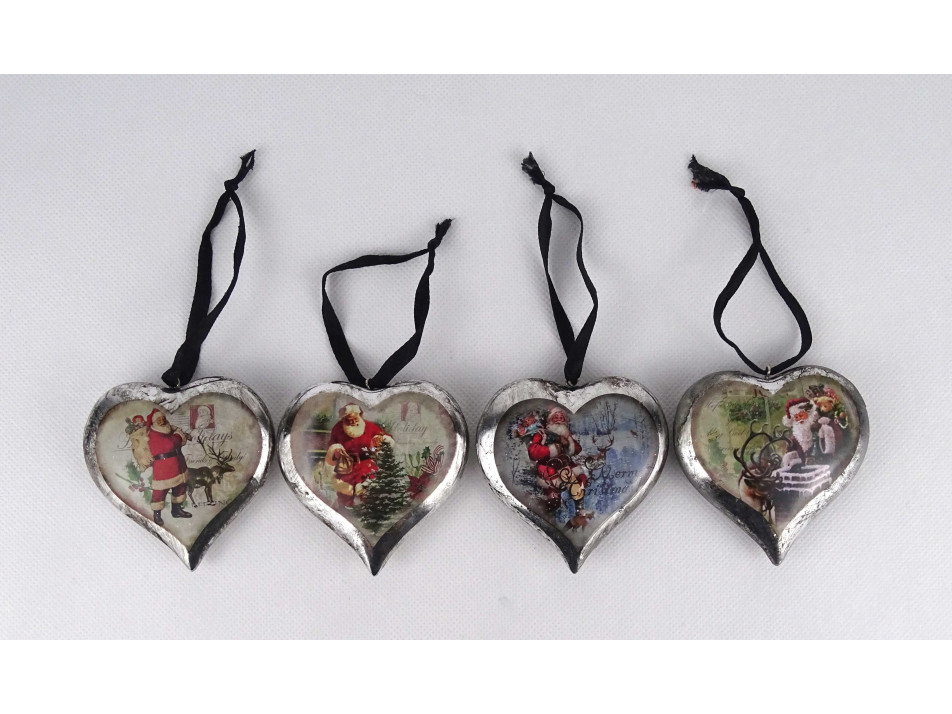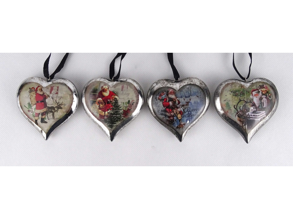 Régi, ezüst színű, szív alakú Mikulás dekorral díszített karácsonyfadísz csomag, 4 darab.