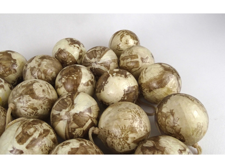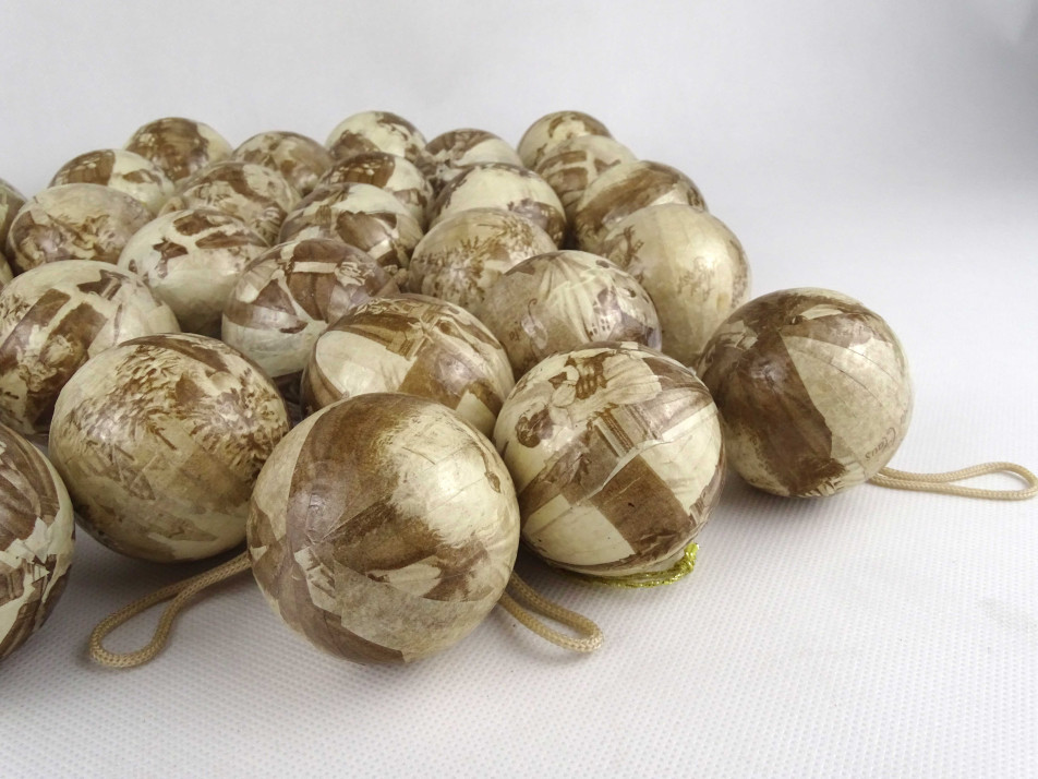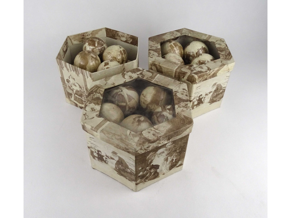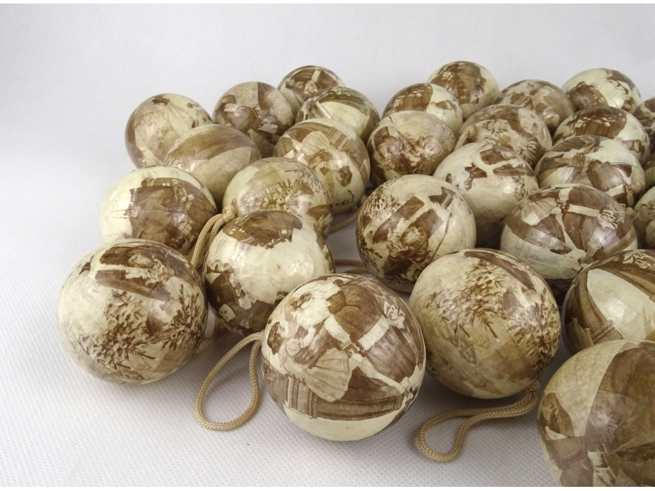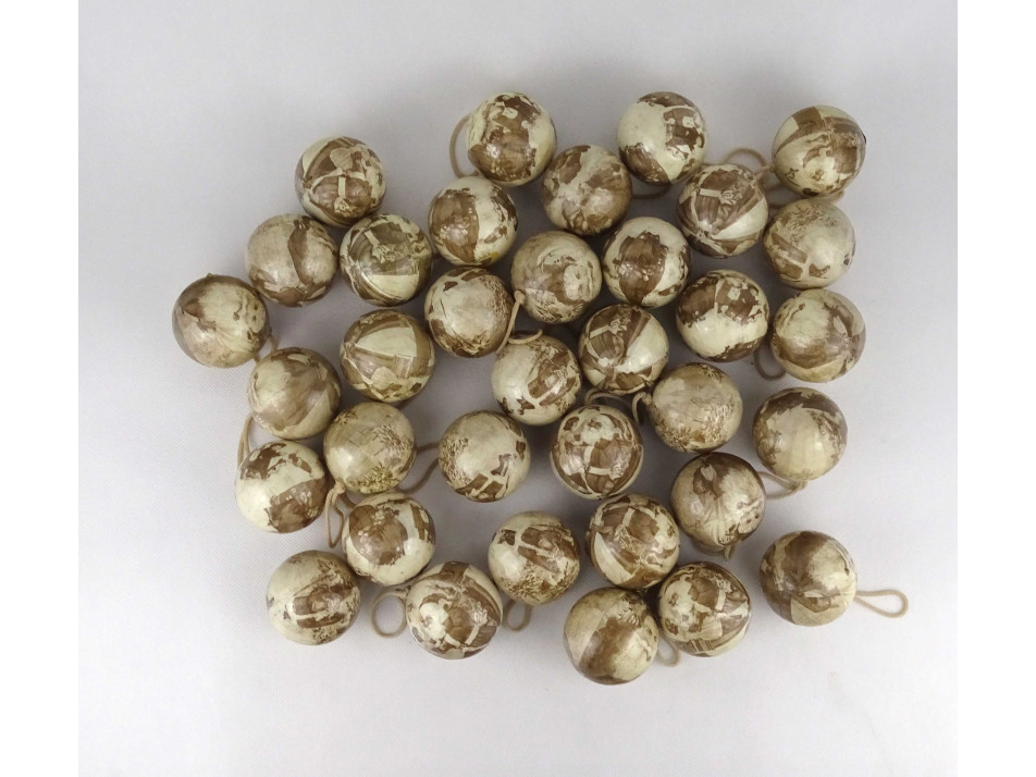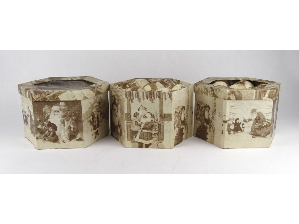 Régi, Mikulás dekorral díszített, krém színű, papír borítású hungarocell gömbökből álló karácsonyfadísz csomag. 35 darab dísz 3 darab hatszögletű dobozban.