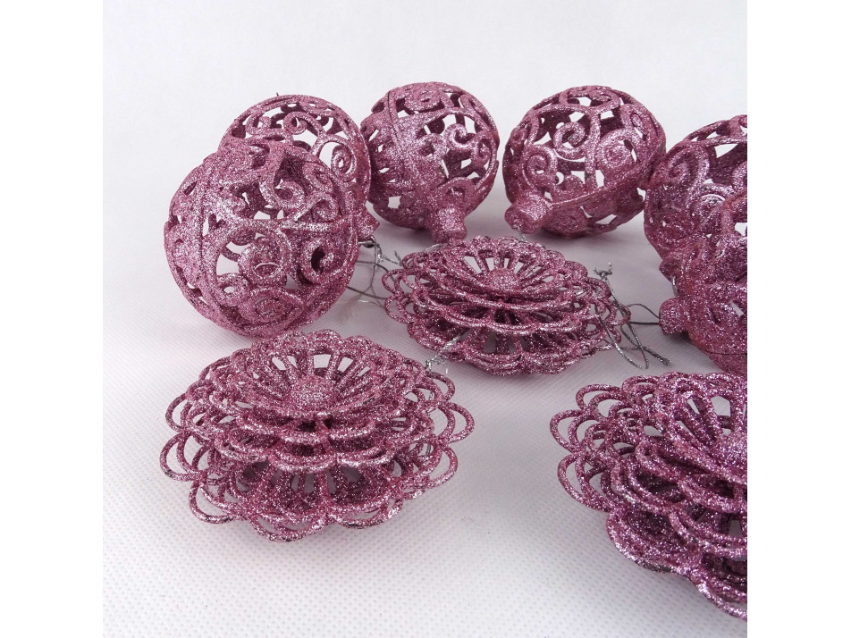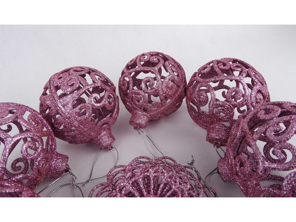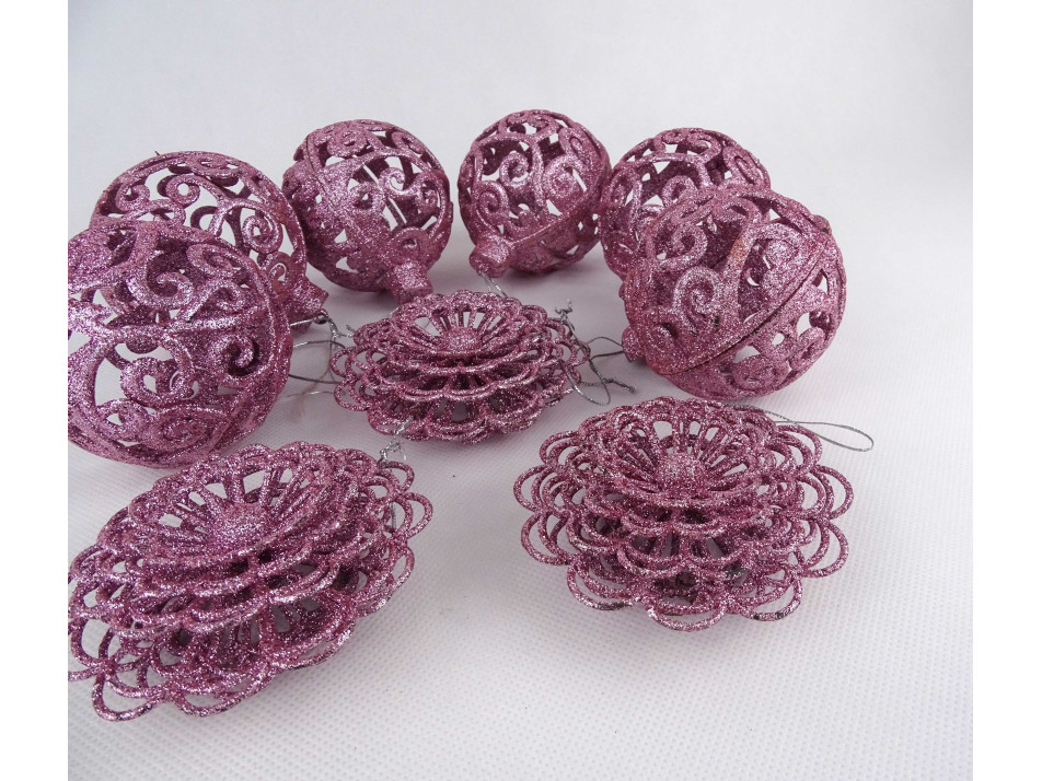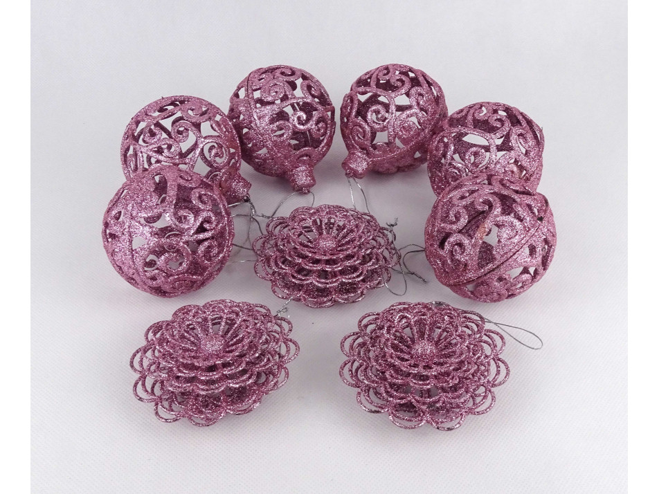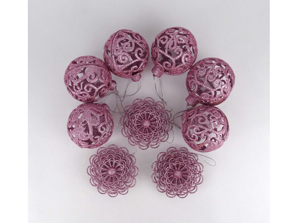 Retro sötét rózsaszín, csillámporos, áttört karácsonyfadísz csomag 9 darab