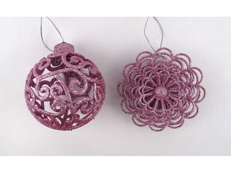 Retro, sötét rózsaszín, csillámporos, áttört műanyag karácsonyfadísz csomag. Két különböző alakú függődísz egy csomagban, 9 darab.