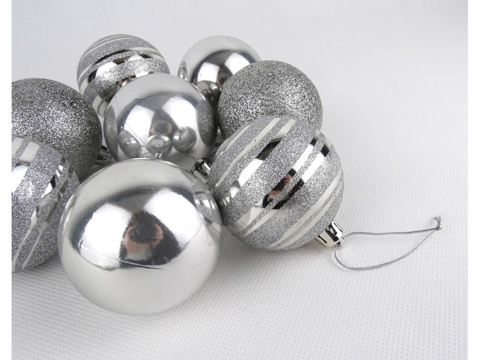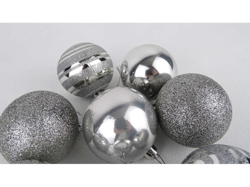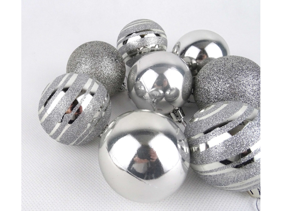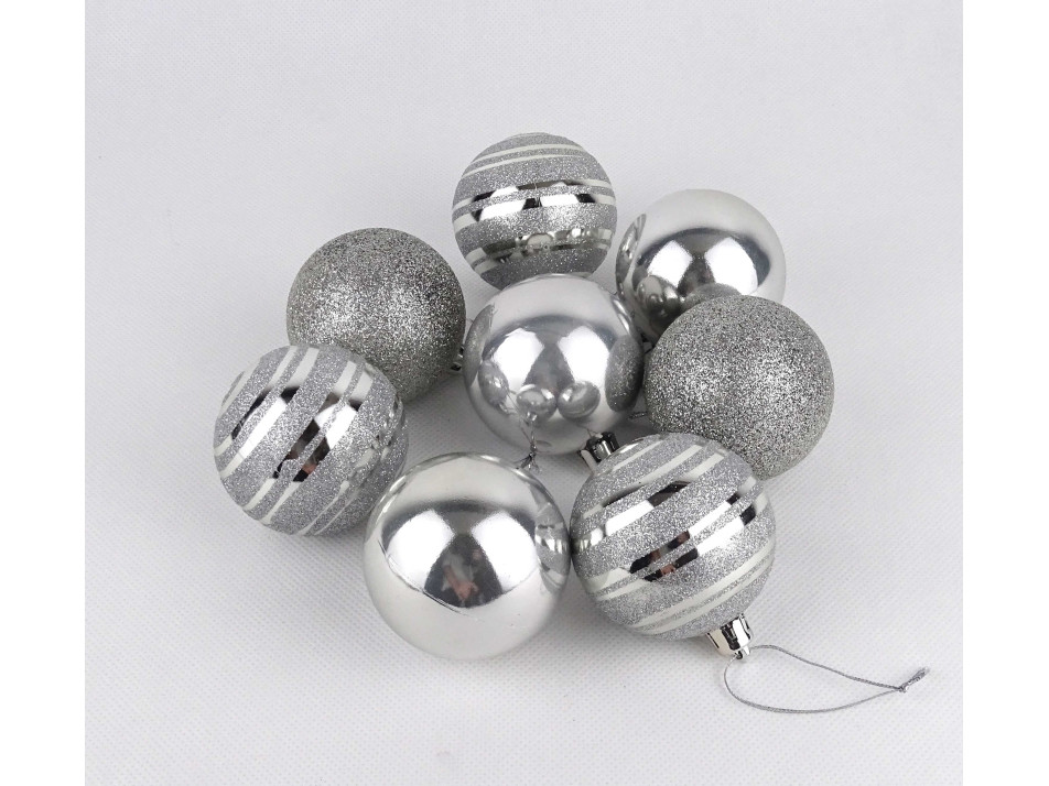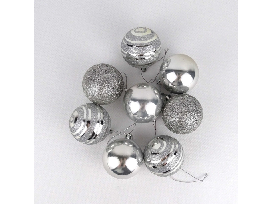 Retro, ezüst színű műanyag karácsonyfadísz csomag. Három különböző felületű, díszítésű gömbdísz egy csomagban, 8 darab.