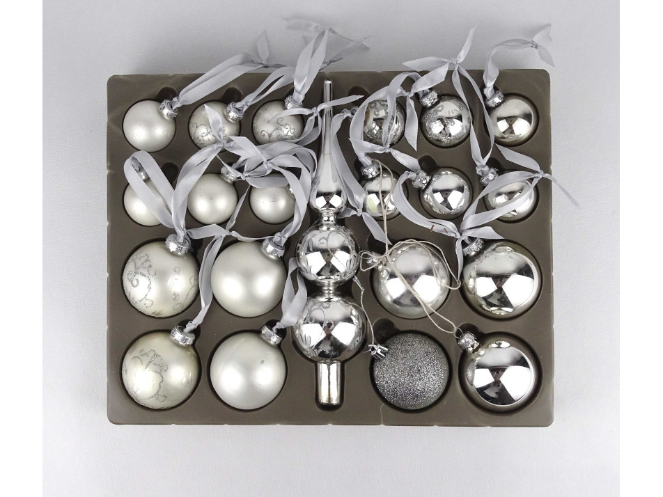 Régi, szép állapotú, ezüst színű üveg karácsonyfadísz, üvegdísz csomag, 21 darab egyben, eredeti papír dobozában.