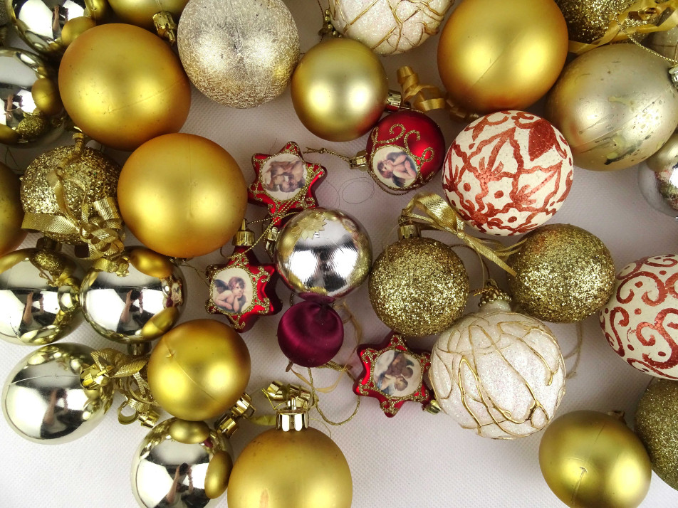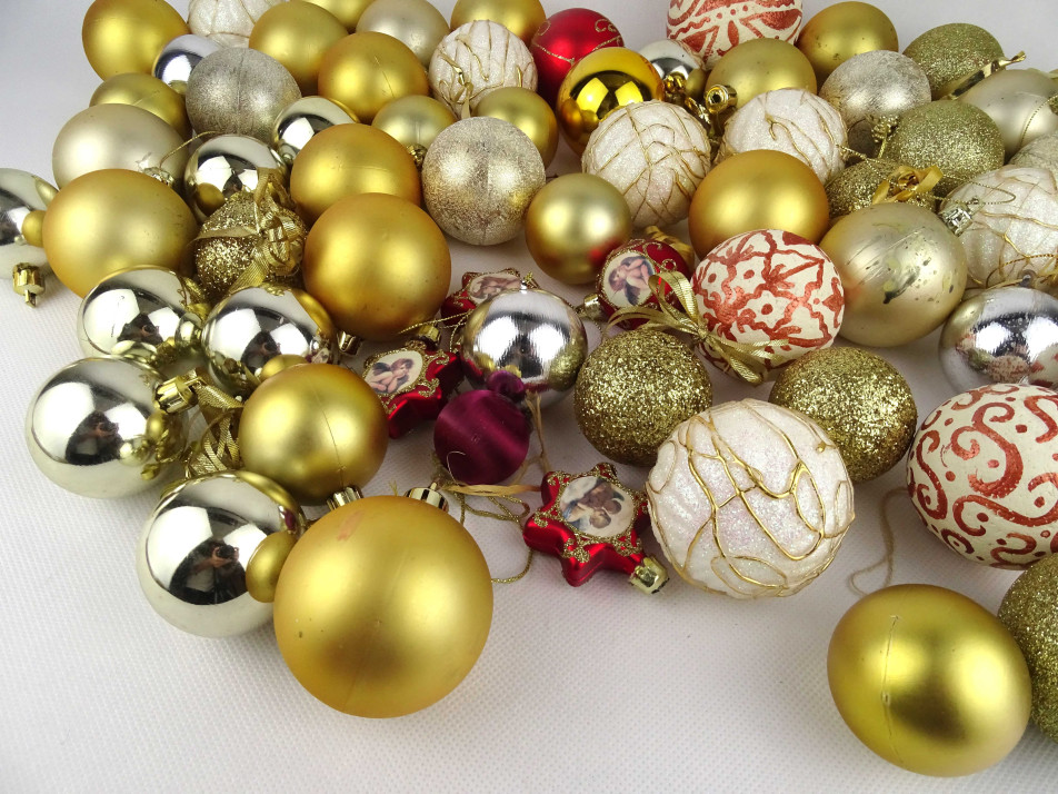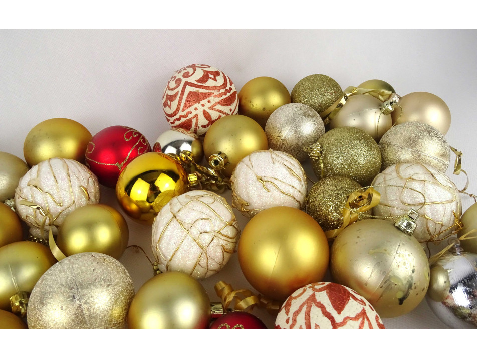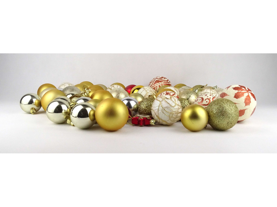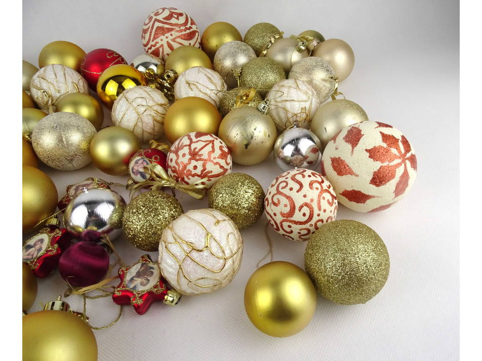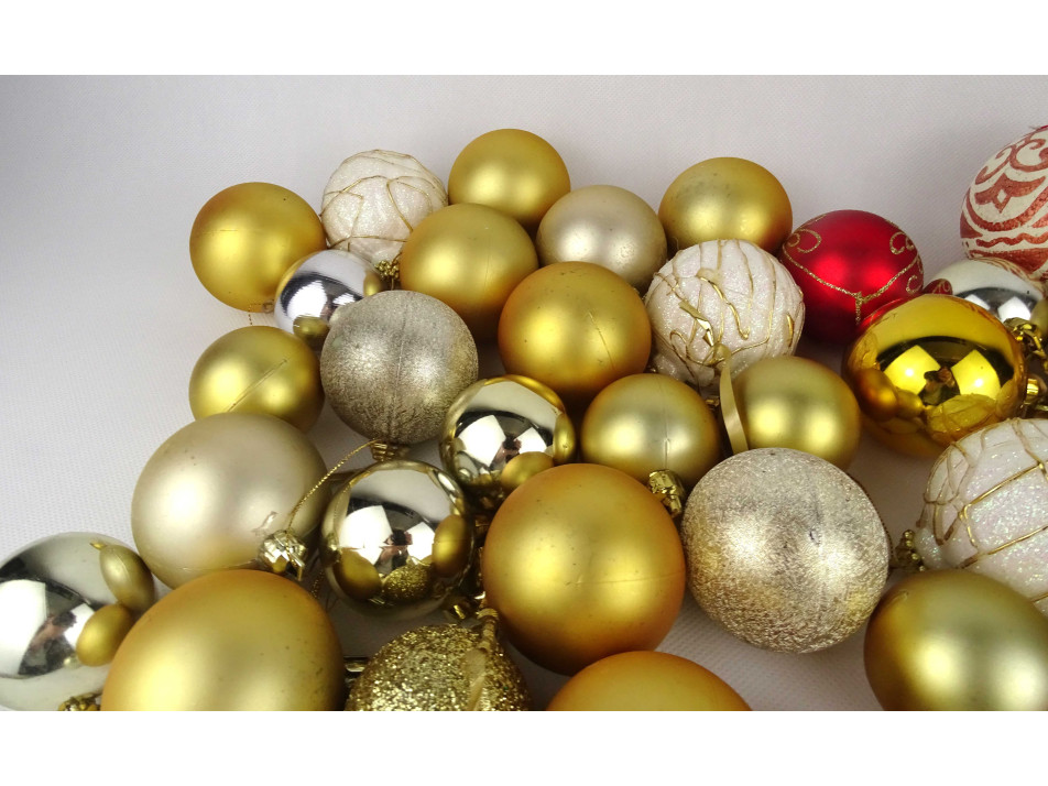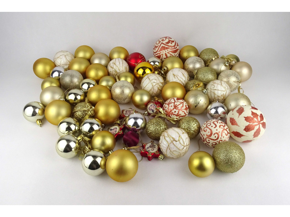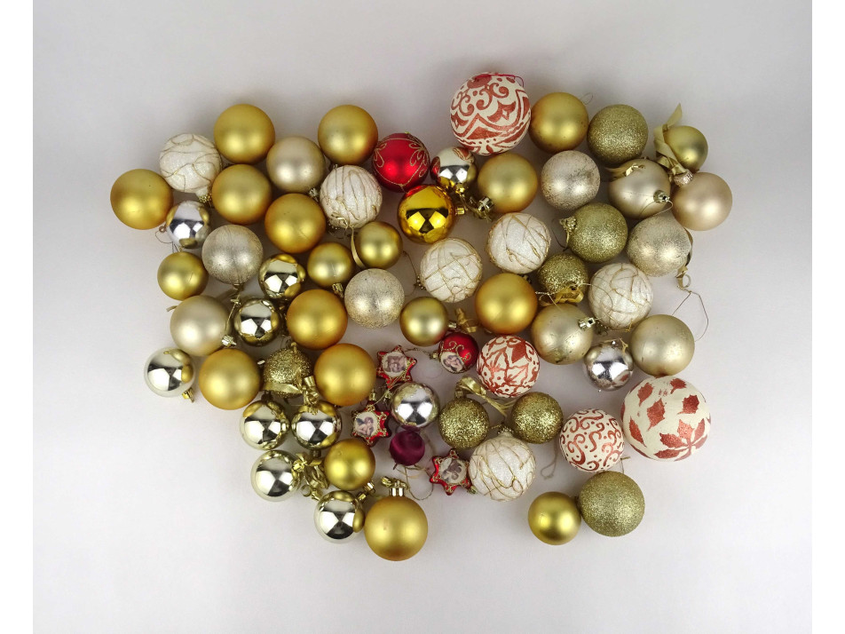 Retro, szép állapotú, többségében arany színű műanyag karácsonyfadísz csomag. Különböző méretű, anyagú és kivitelű gömb díszek egy csomagban, 64 darab.