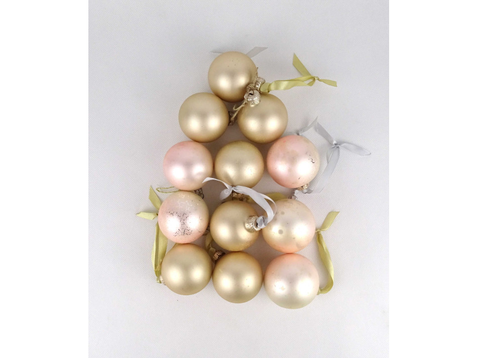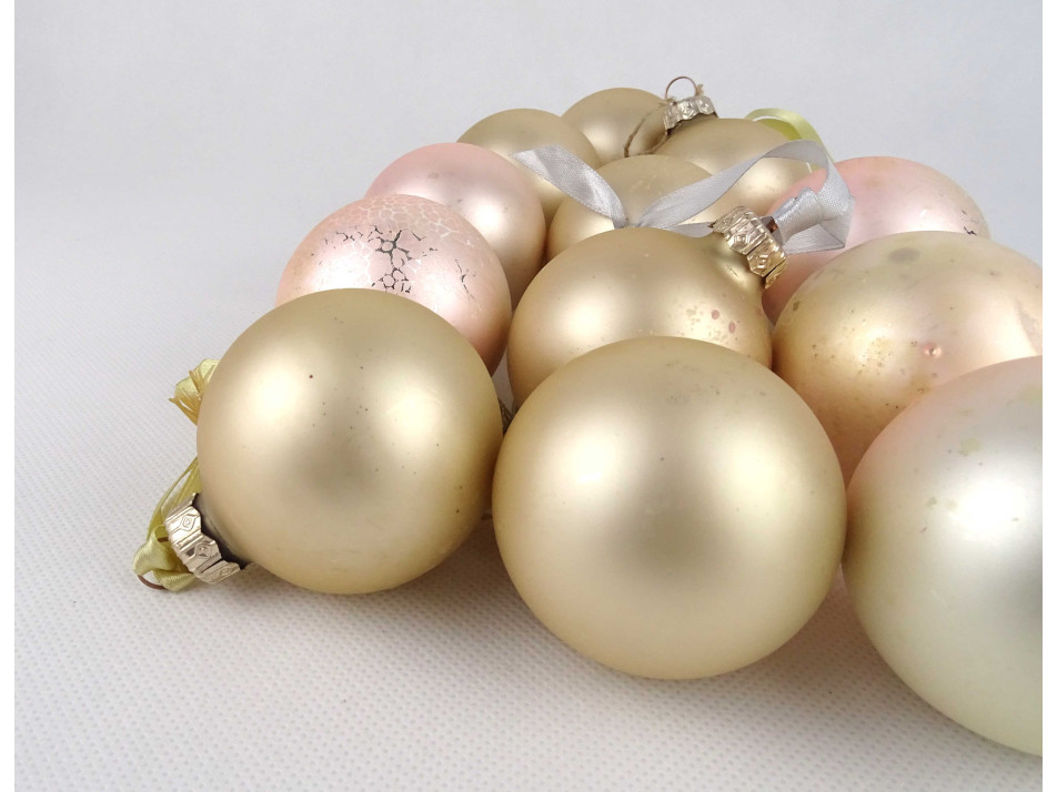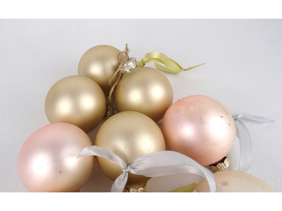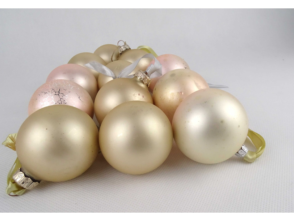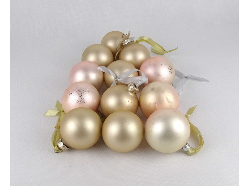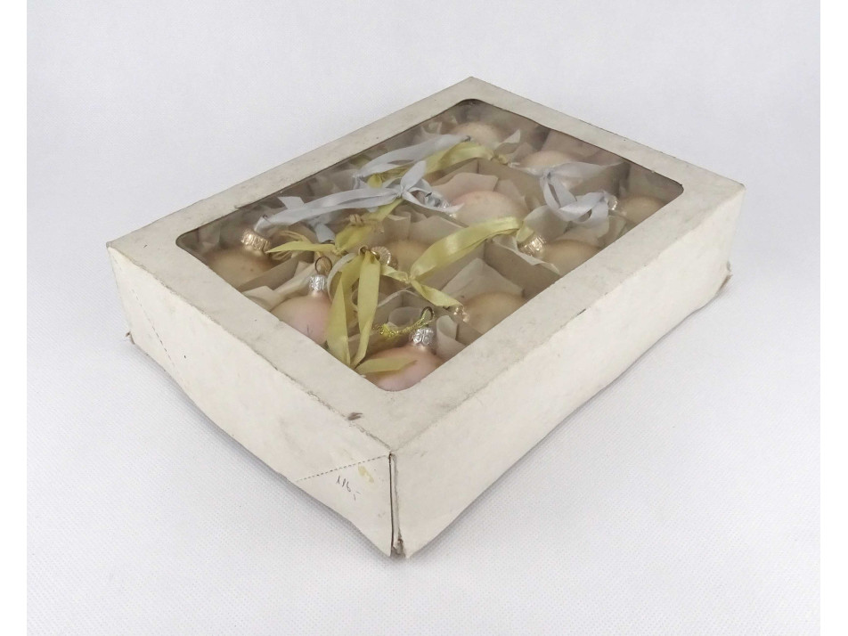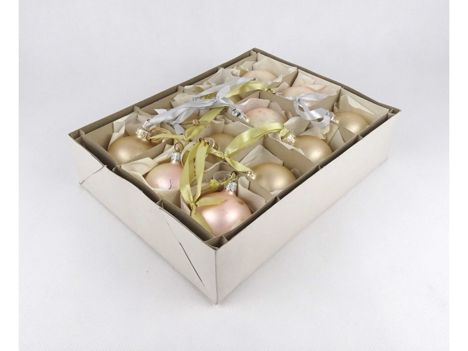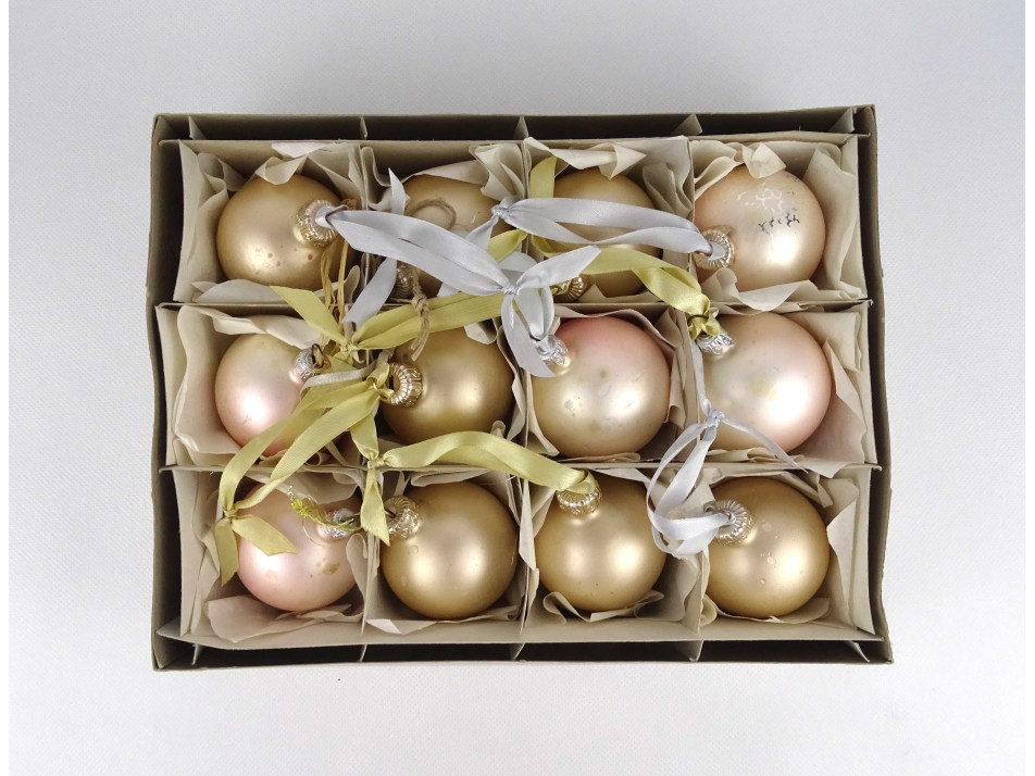 Régi, szép állapotú, arany színű üveg gömb karácsonyfadísz, üvegdísz csomag, 12 darab egyben, eredeti papír dobozában.