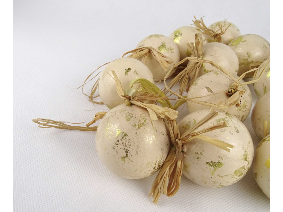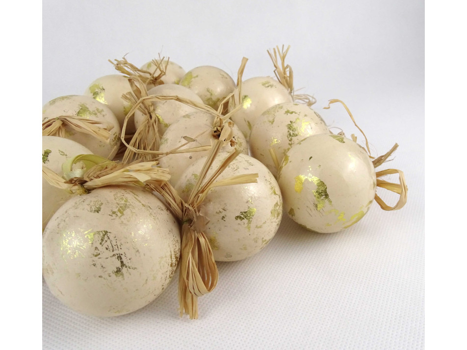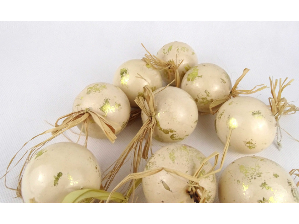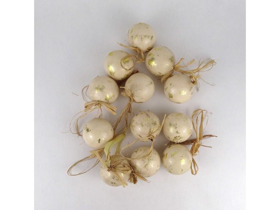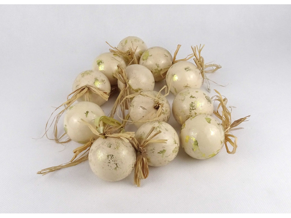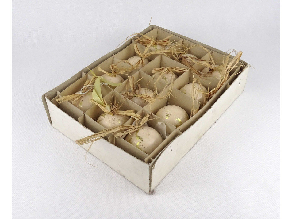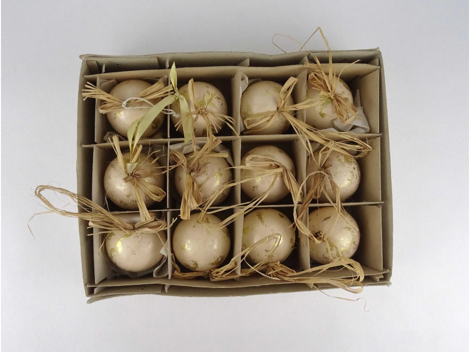 Retro, szép állapotú, arany színű, festett, szalma akasztós, műanyag karácsonyfadísz csomag, 12 darab, papír dobozban.