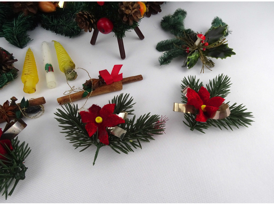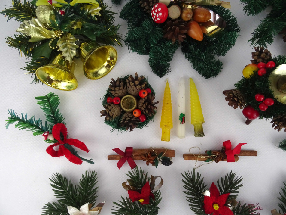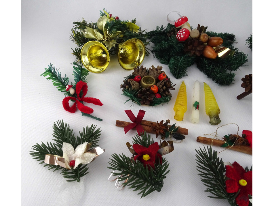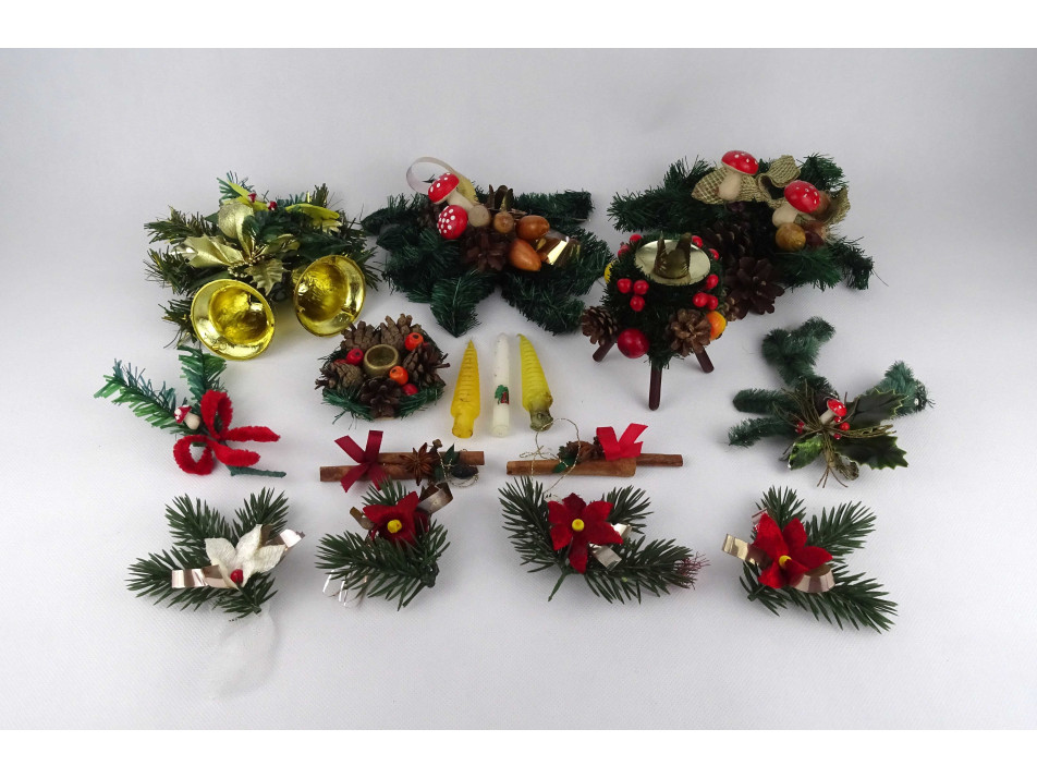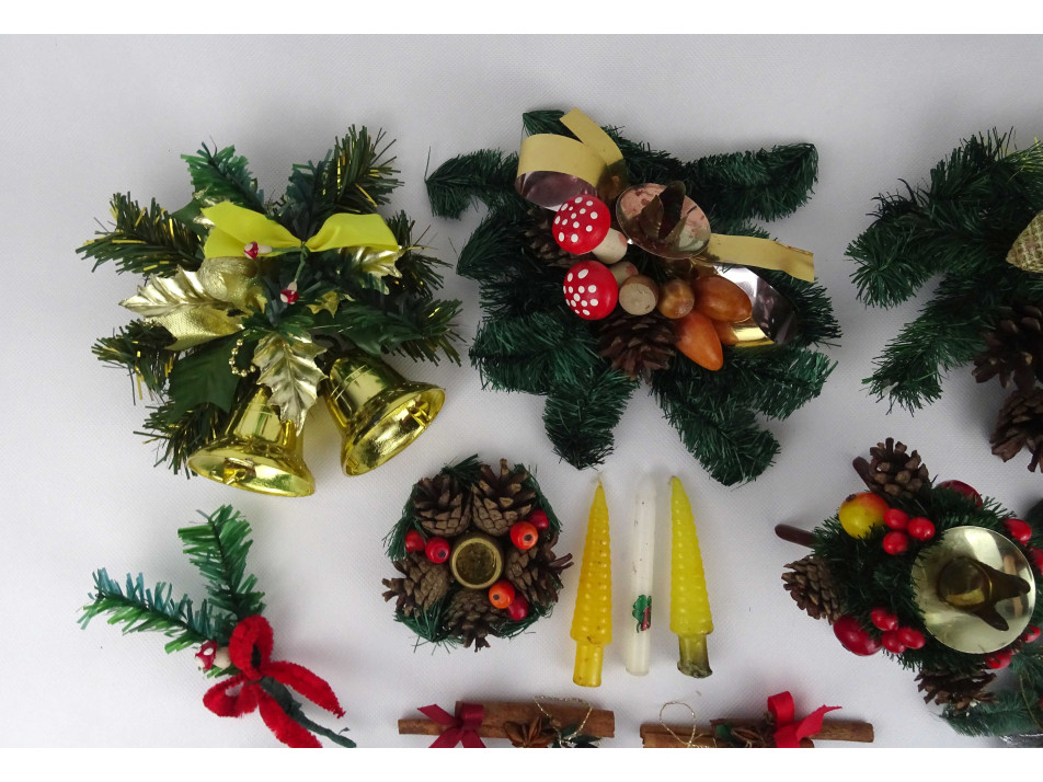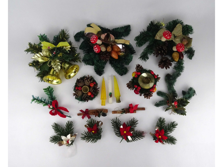 Hibátlan állapotú karácsonyi dekorációs csomag, műanyag fenyőágat utánzó asztali gyertyatartók, asztali- és falidíszek, 14 darab.