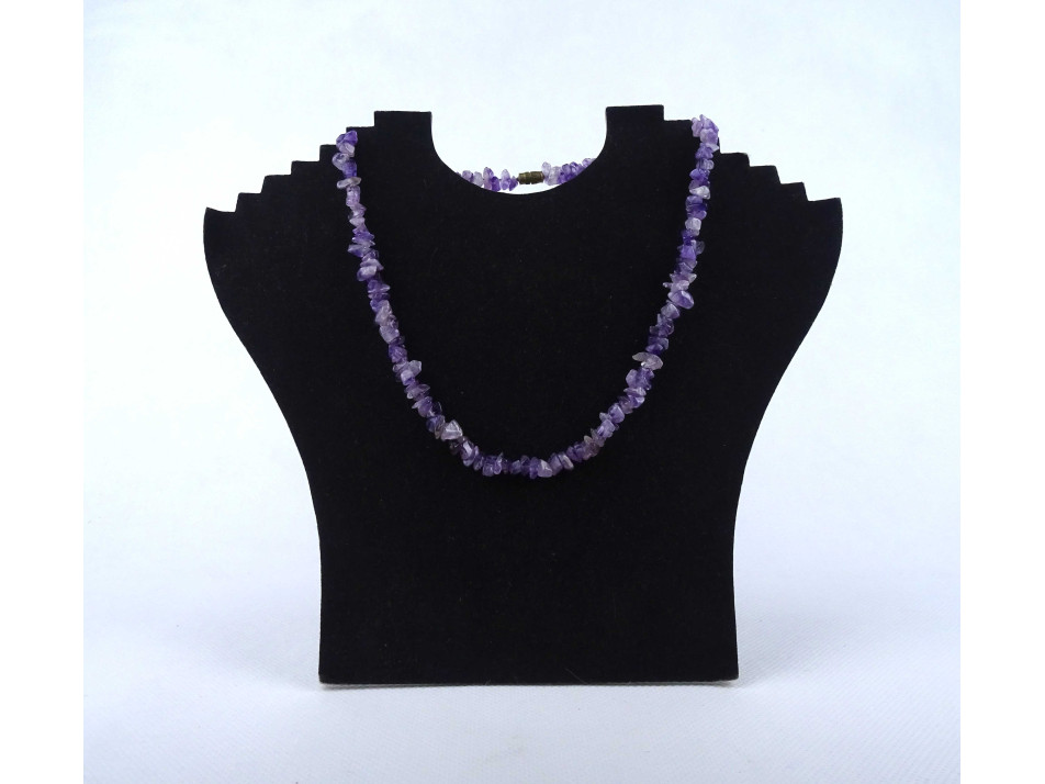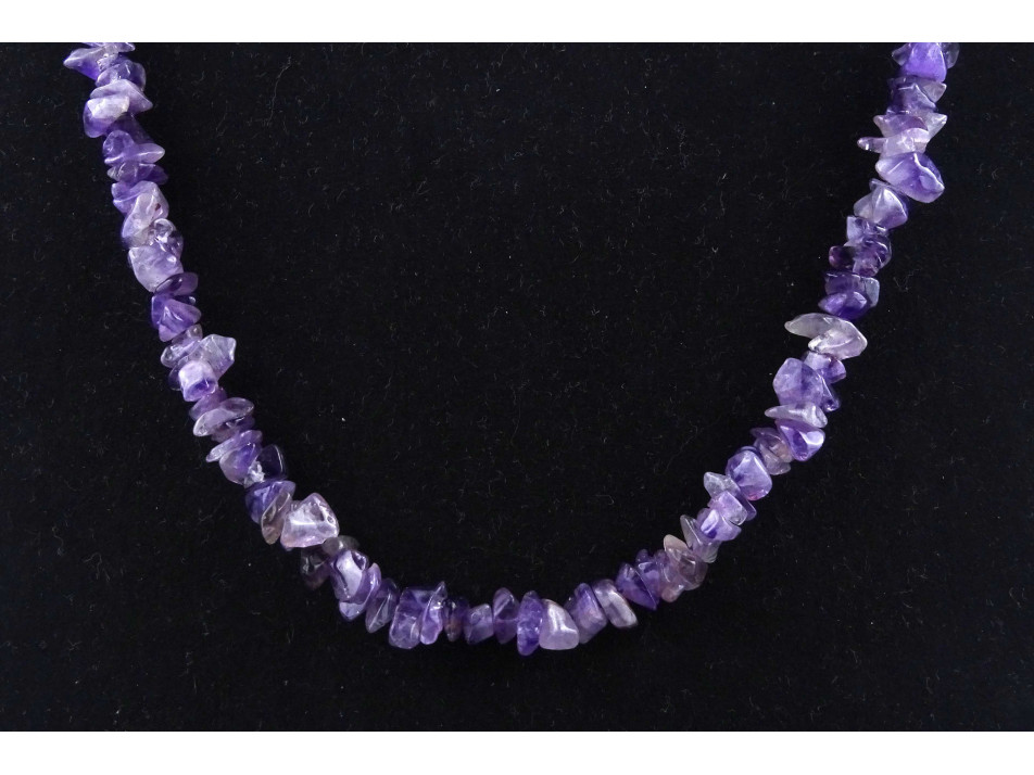 Hibátlan állapotú, szabálytalan alakú, lila színű ametiszt ásványokból fűzött nyaklánc csavaros zárral.