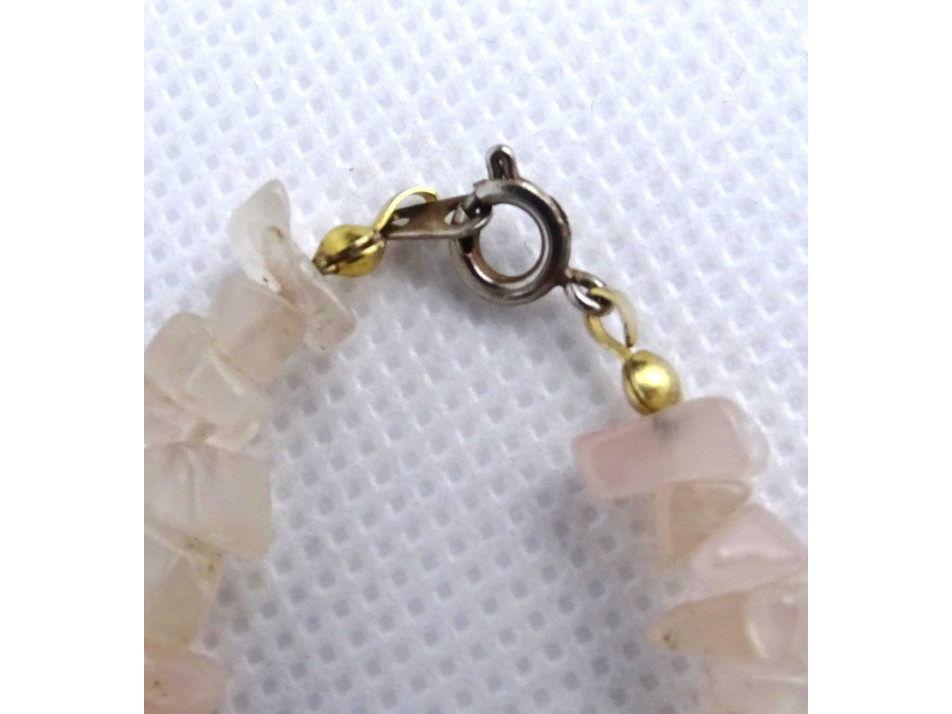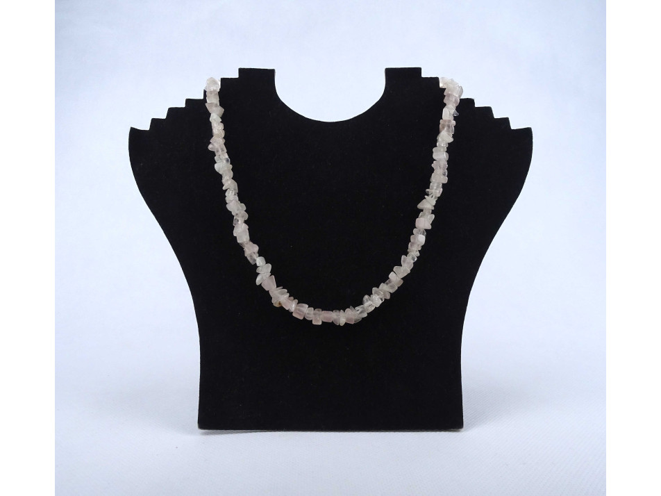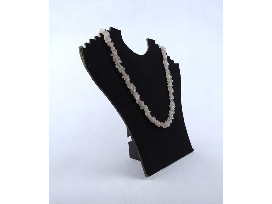 Hibátlan állapotú, szabálytalan alakú, halvány rózsaszín színű rózsakvarc ásványokból fűzött, csattal rendelkező bizsu ékszer, ásvány nyaklánc.