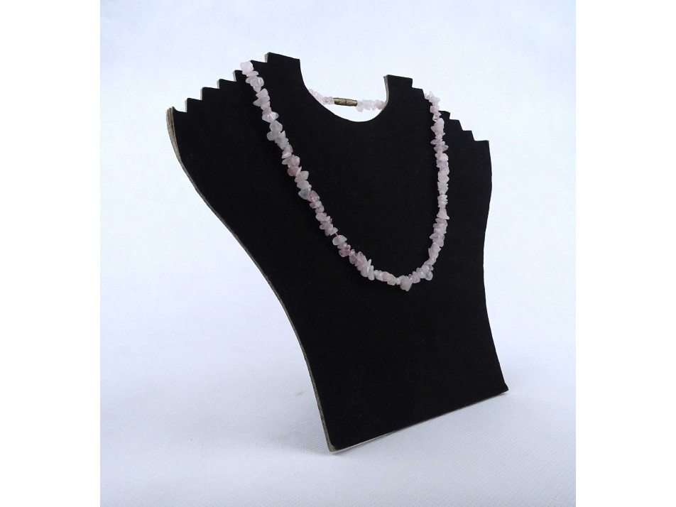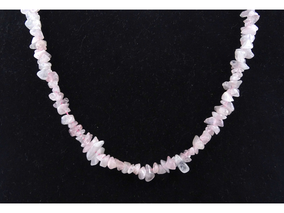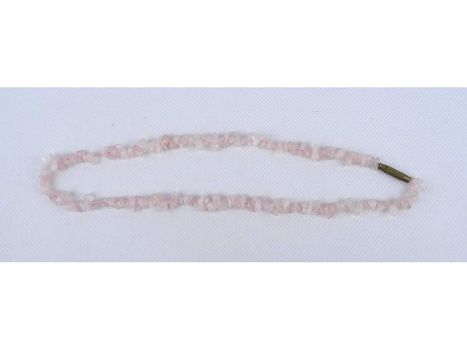 Hibátlan állapotú, szabálytalan alakú rózsaszín színű rózsakvarc ásványokból fűzött, csavaros csattal rendelkező bizsu ékszer, ásvány nyaklánc.