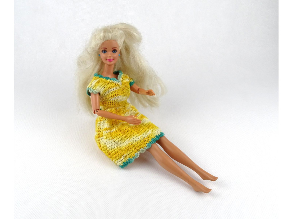 Jó állapotú Barbie baba, házilag készített ruhában, eredeti fülbevalóval. Dereka forgatható és hajlítható. Kezei és lábai is mozgathatóak.