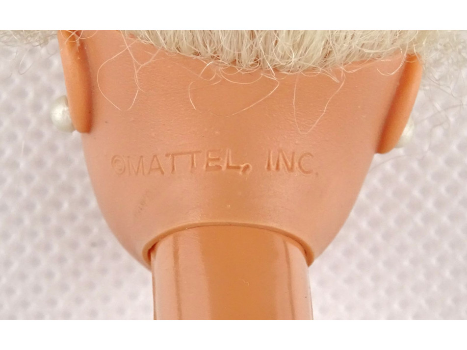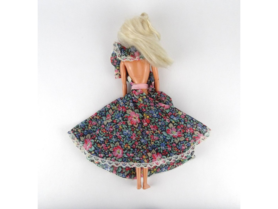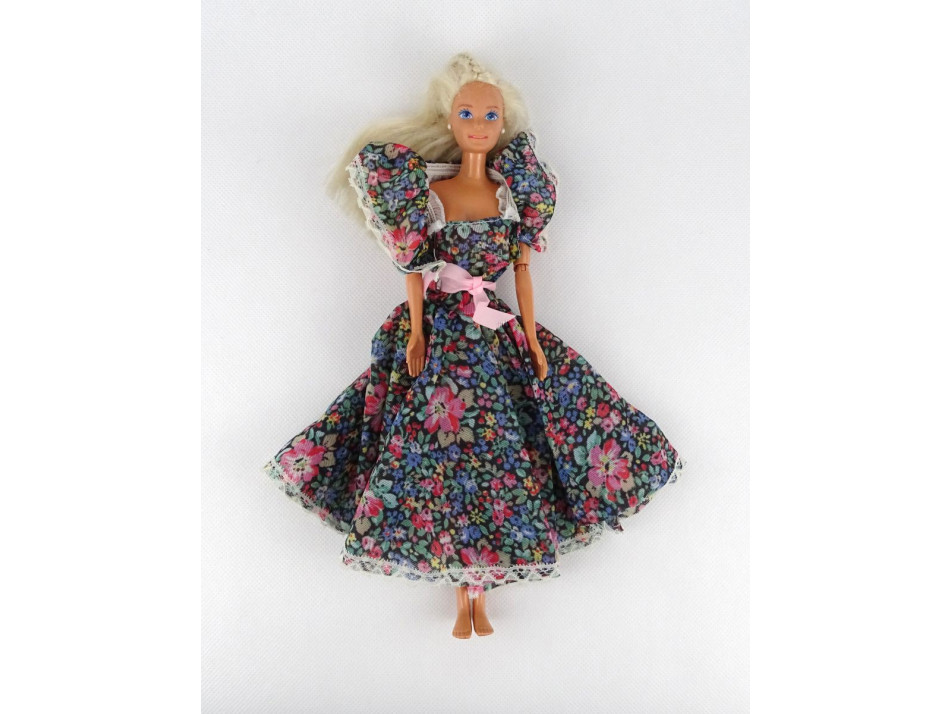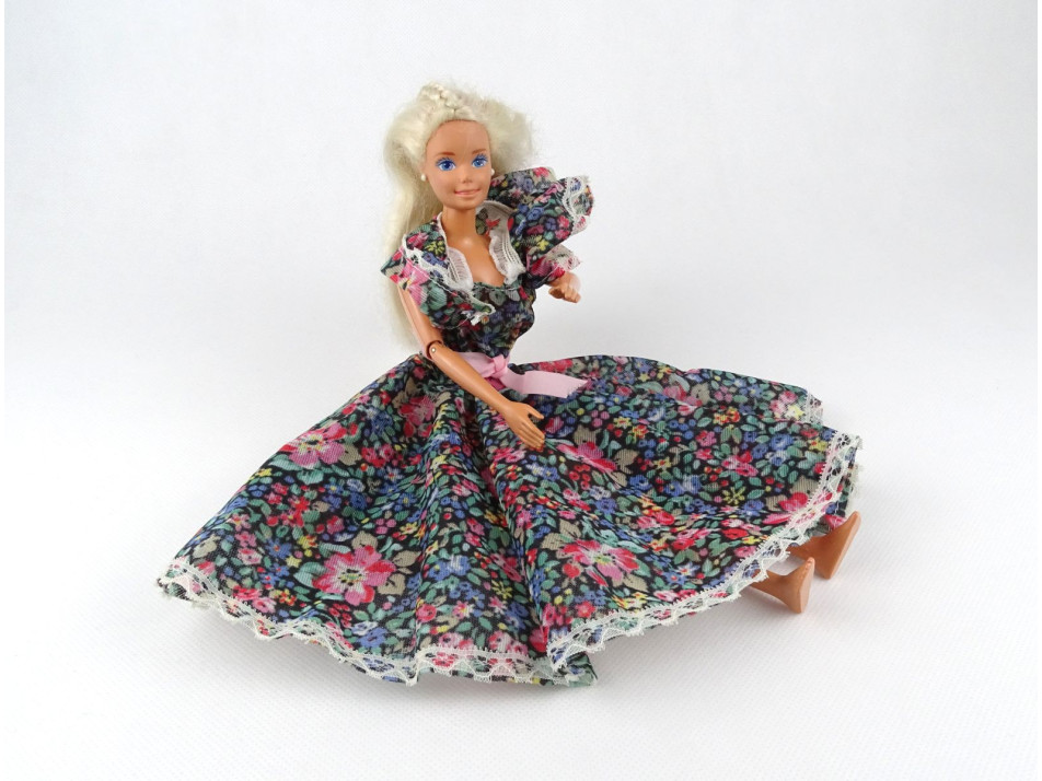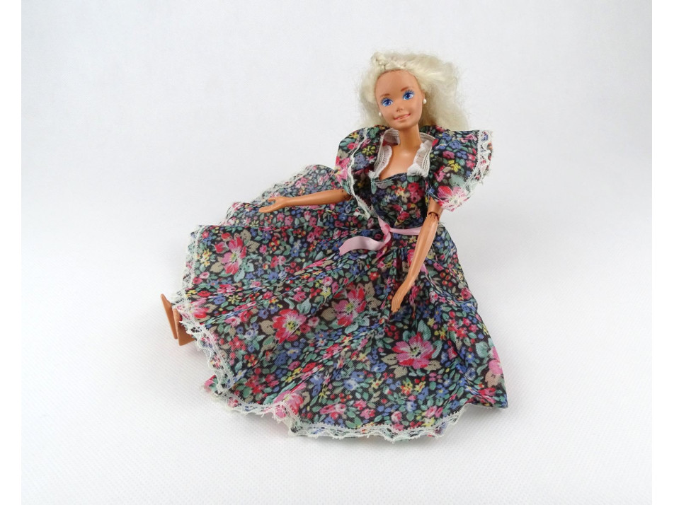 Jó állapotú Barbie baba, házilag készített virágos ruhában, eredeti fülbevalóval. Dereka forgatható és hajlítható. Kezei és lábai is mozgathatóak.