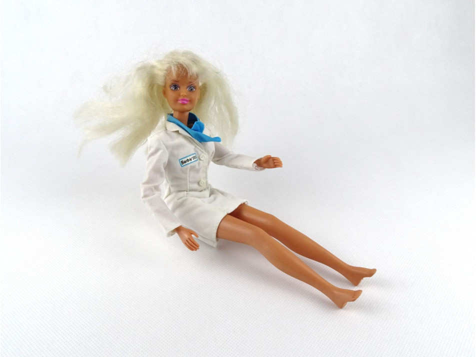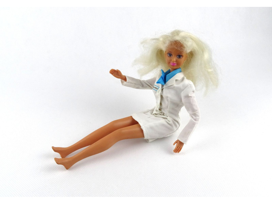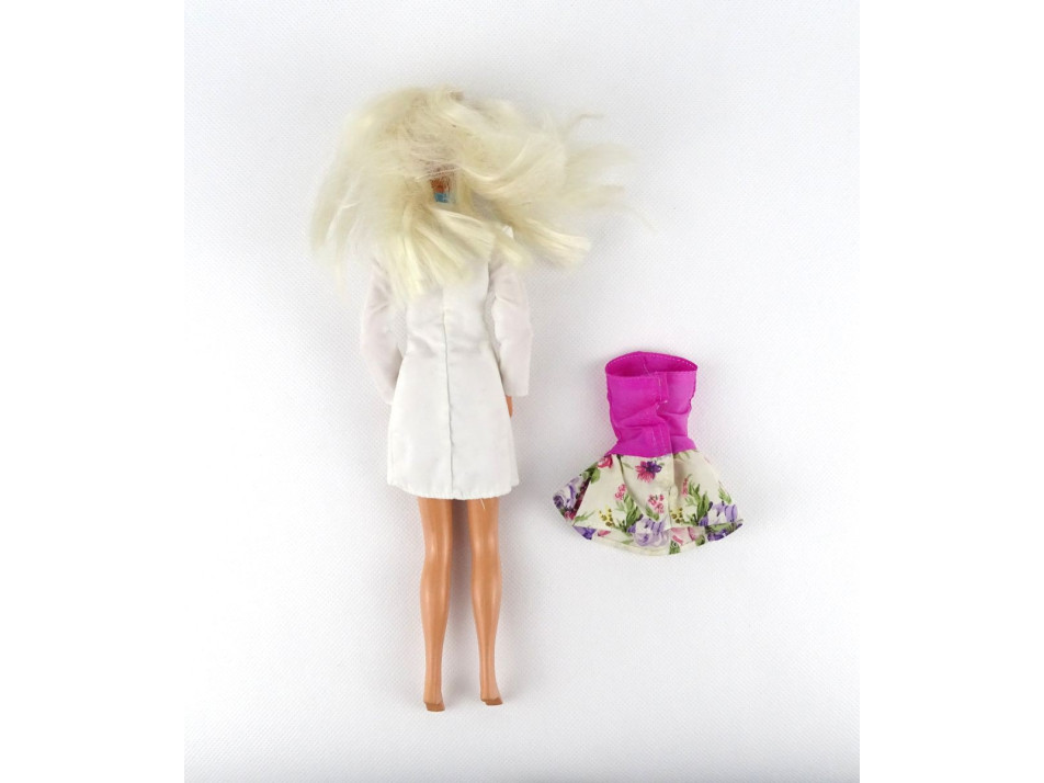 Hibátlan állapotú bájos arcú Barbie orvosi ruhában. Dereka hajlítható. Kezei és lábai mozgathatóak. Feliratok: 1994 HASBRO INC. Kiegészítő: - 1 darab virágos, rózsaszín ruha