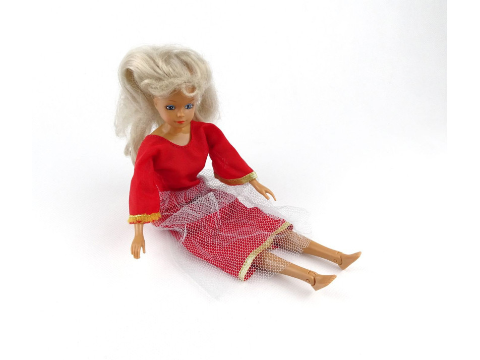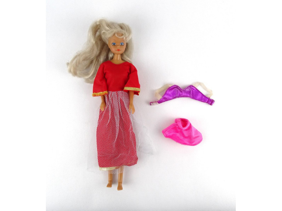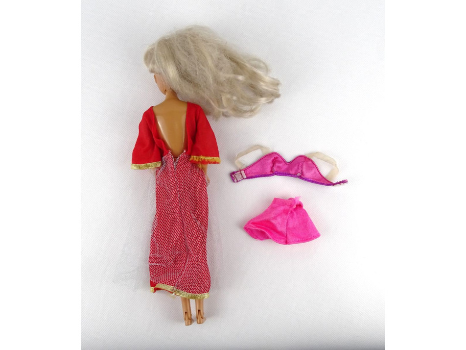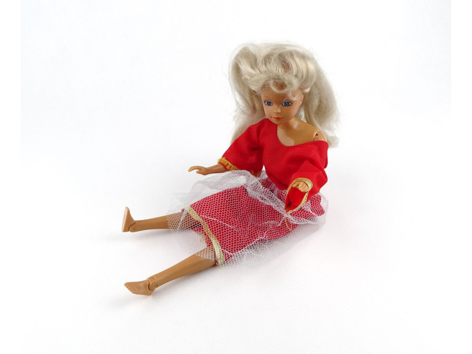 Hibátlan állapotú bájos arcú Barbie baba piros ruhában. Dereka forgatható és hajlítható. Kezei és lábai is mozgathatóak.