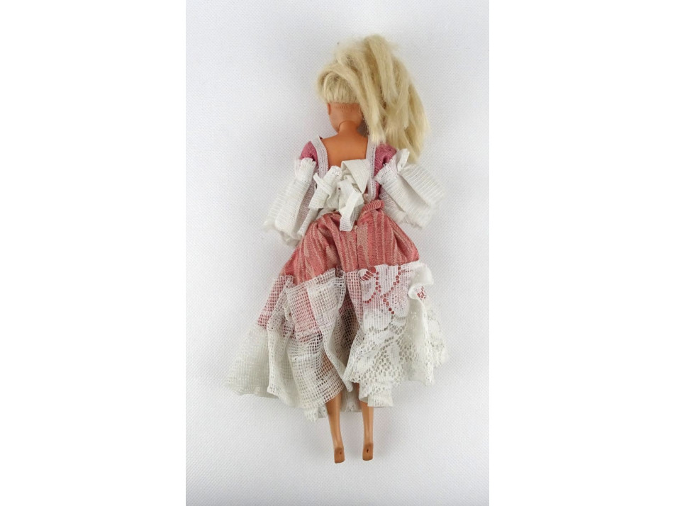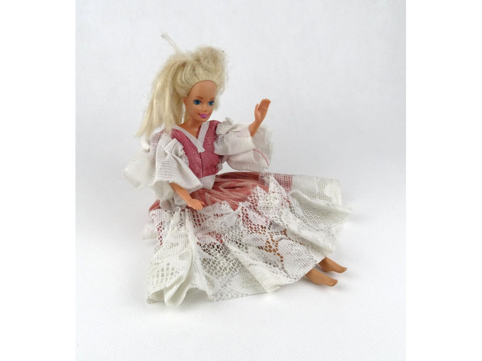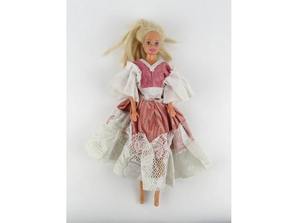 Jó állapotú Barbie baba, házilag készített estélyi ruhában. Dereka forgatható és hajlítható. Kezei és lábai is mozgathatóak.