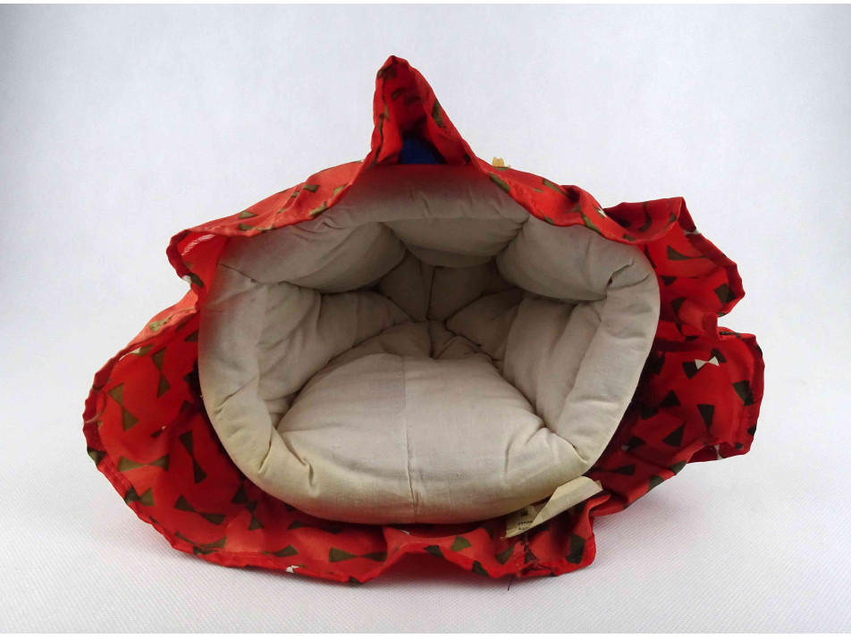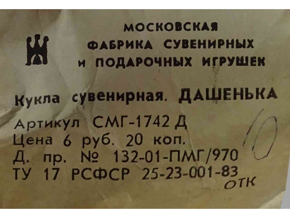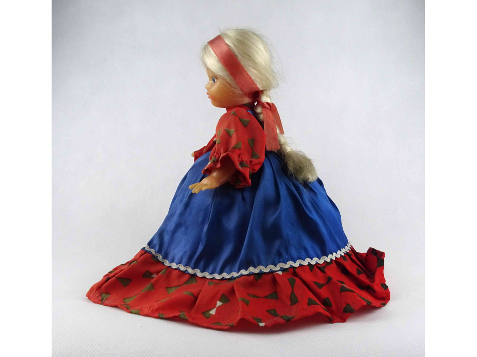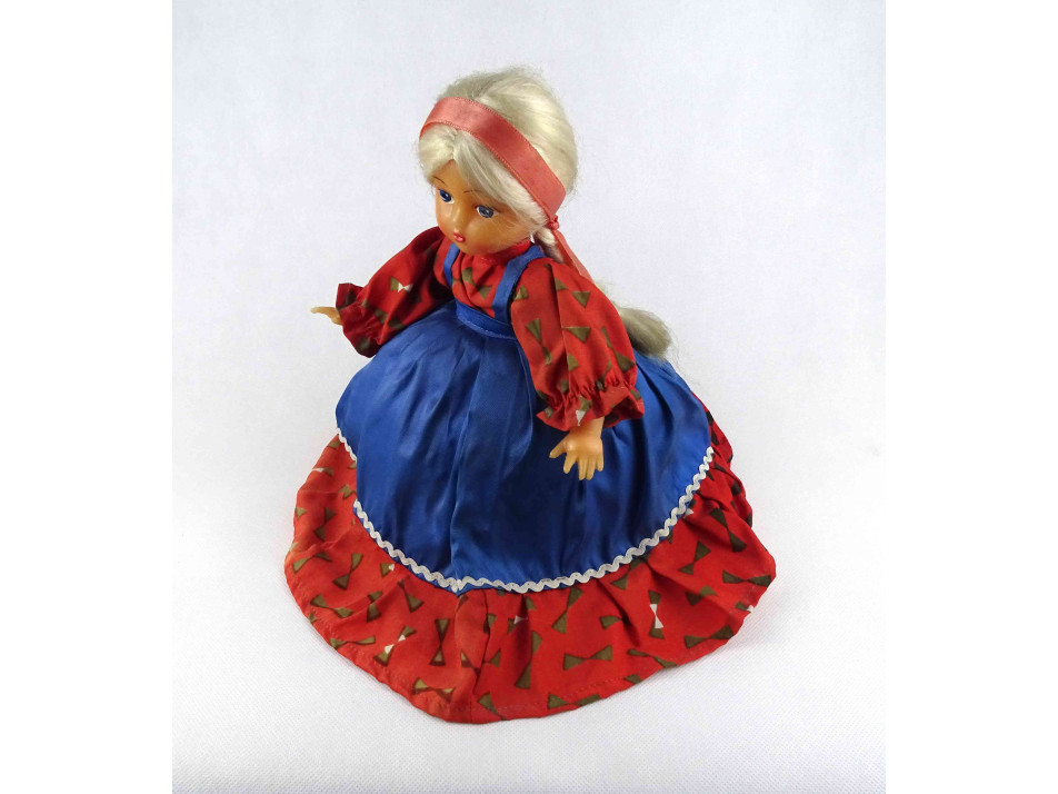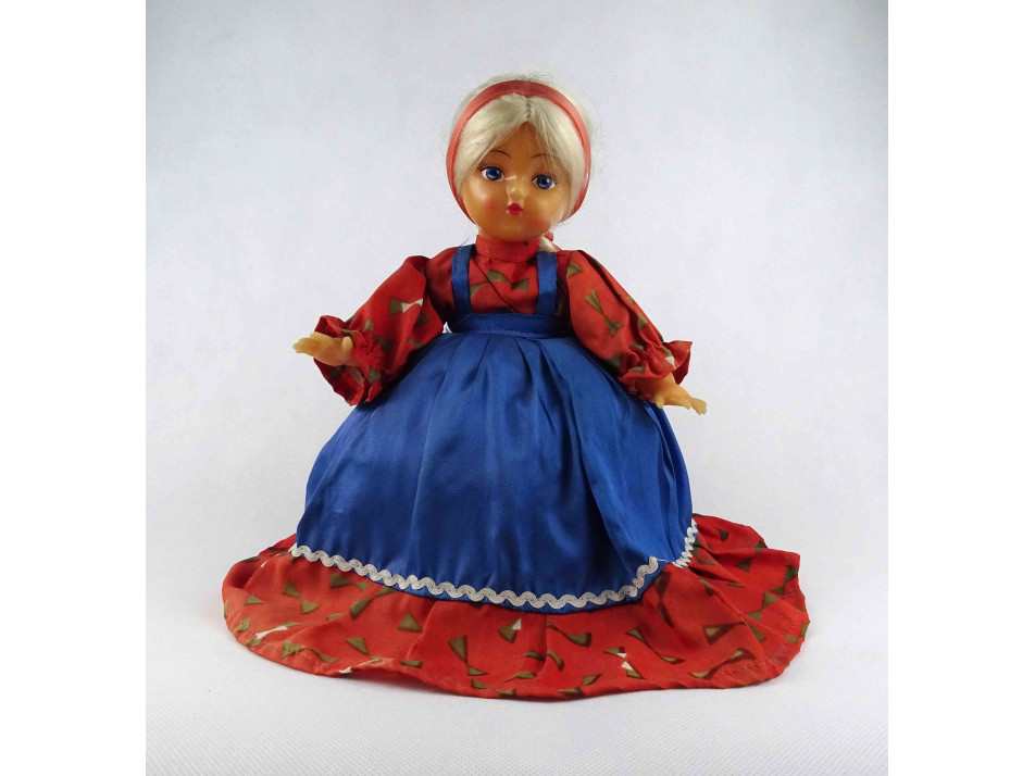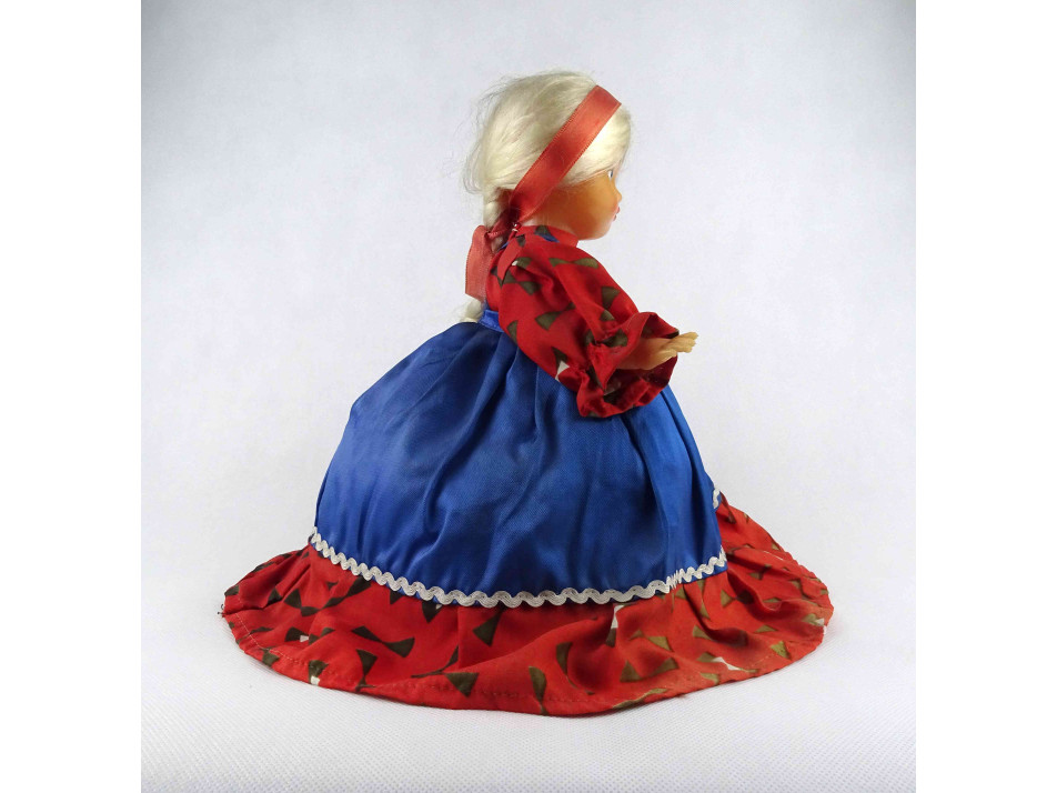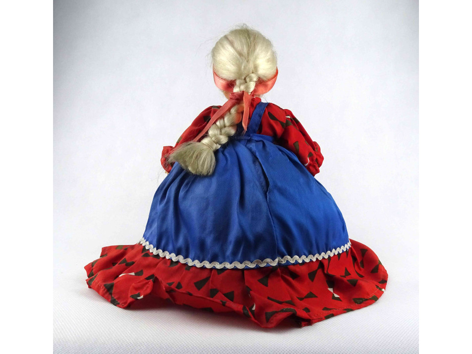 Retro, textil testű, műanyag fejű és karú, orosz szőke, hosszú copfos játék baba. A baba nagy rakott szoknyája alatt nincsenek lábak. Olyan kialakítású, mint a régi teababák.