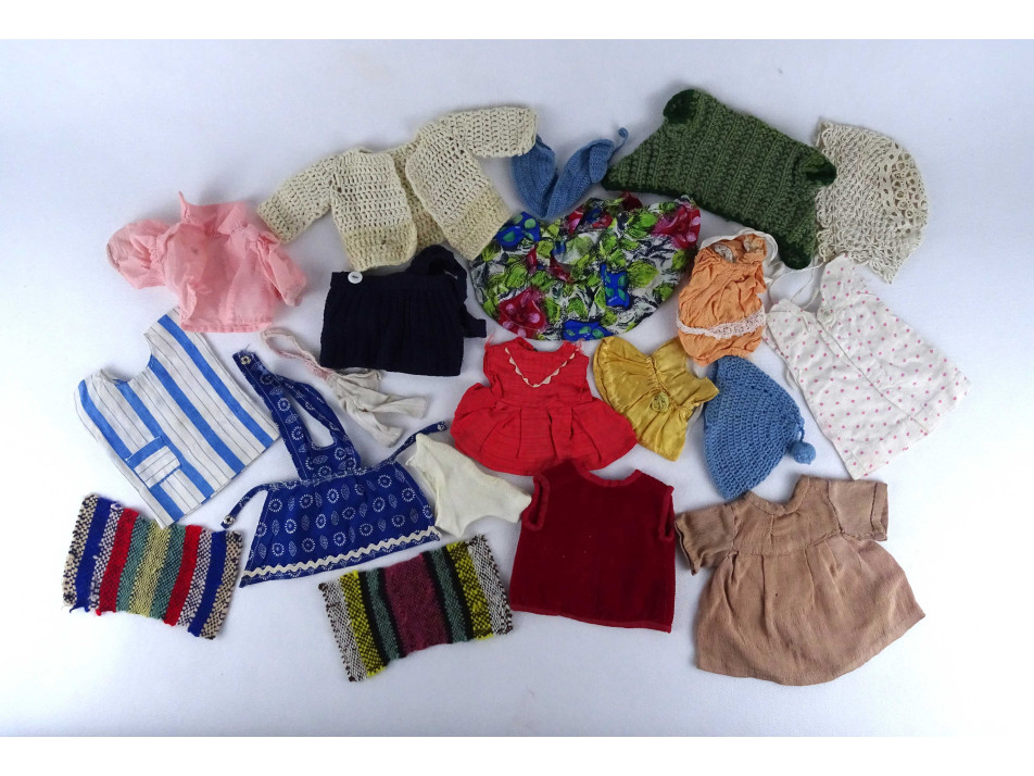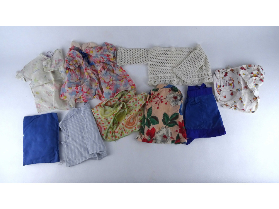 Régi, vegyes játékbaba ruha és játék ágynemű huzat csomag. Több darab foltos, sérült. Különböző méretű játék babákra lehetnek jók.