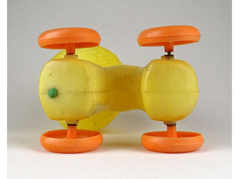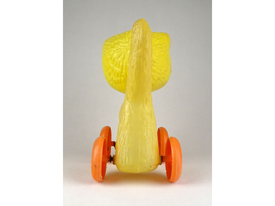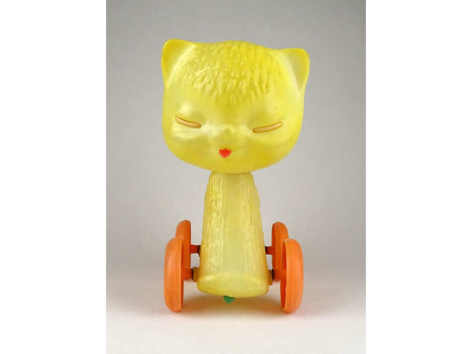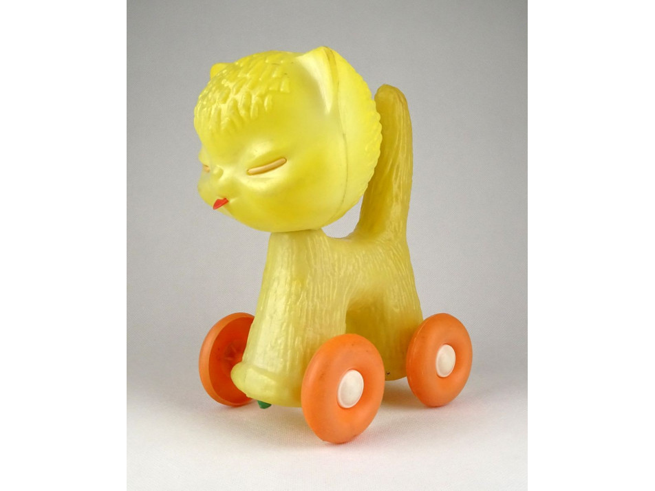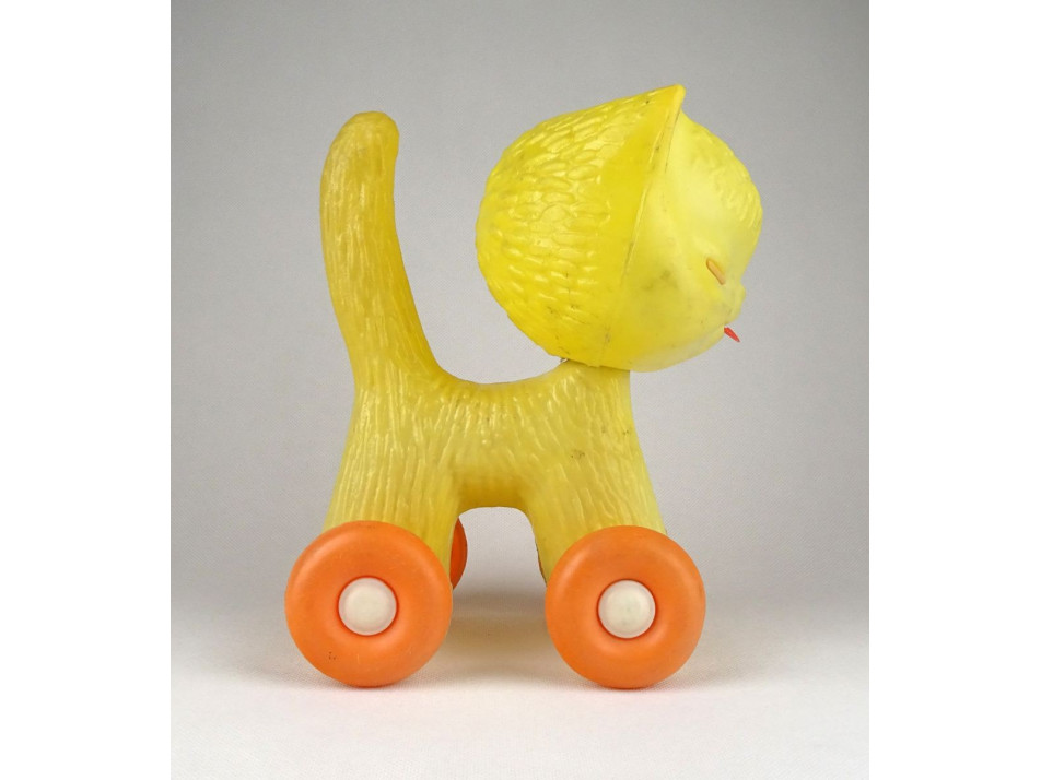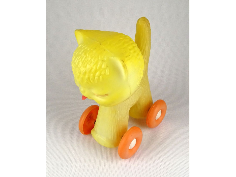 Régi, retro gurulós citromsárga műanyag gyerekjáték cica az 1960-as, 70-es évekből. DMSZ fröccsöntött műanyag játék. Debreceni Műanyagipari Szövetkezet.