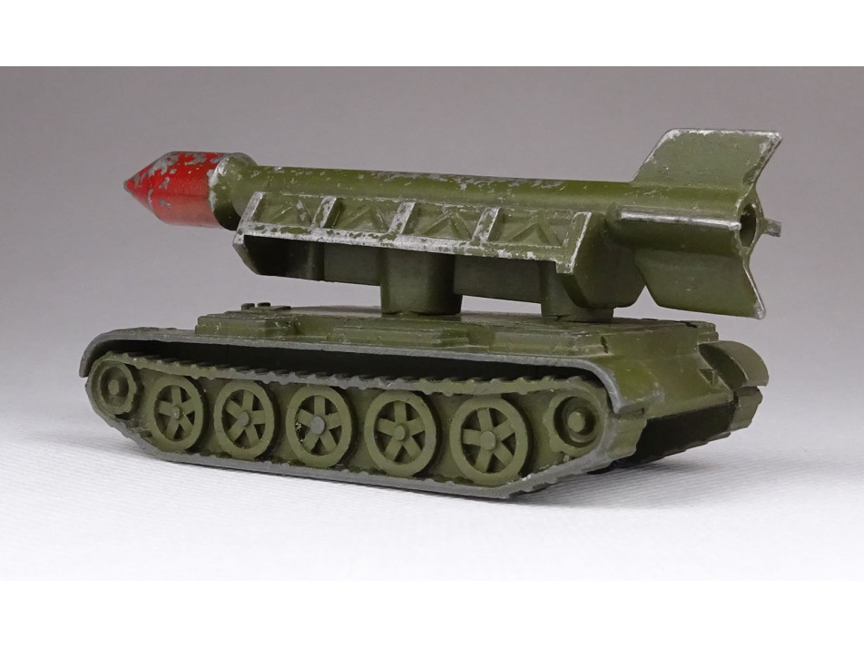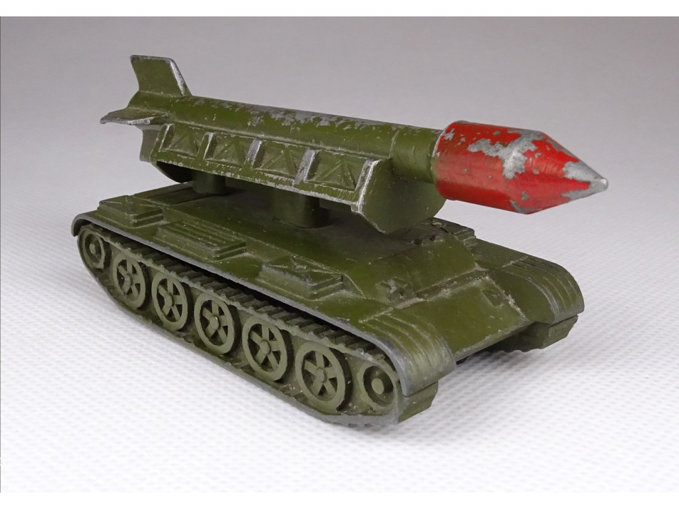 Retro fém harckocsi, lánctalpas és gumikerekes orosz, illetve szovjet harci jármű, rakéta kilövő.