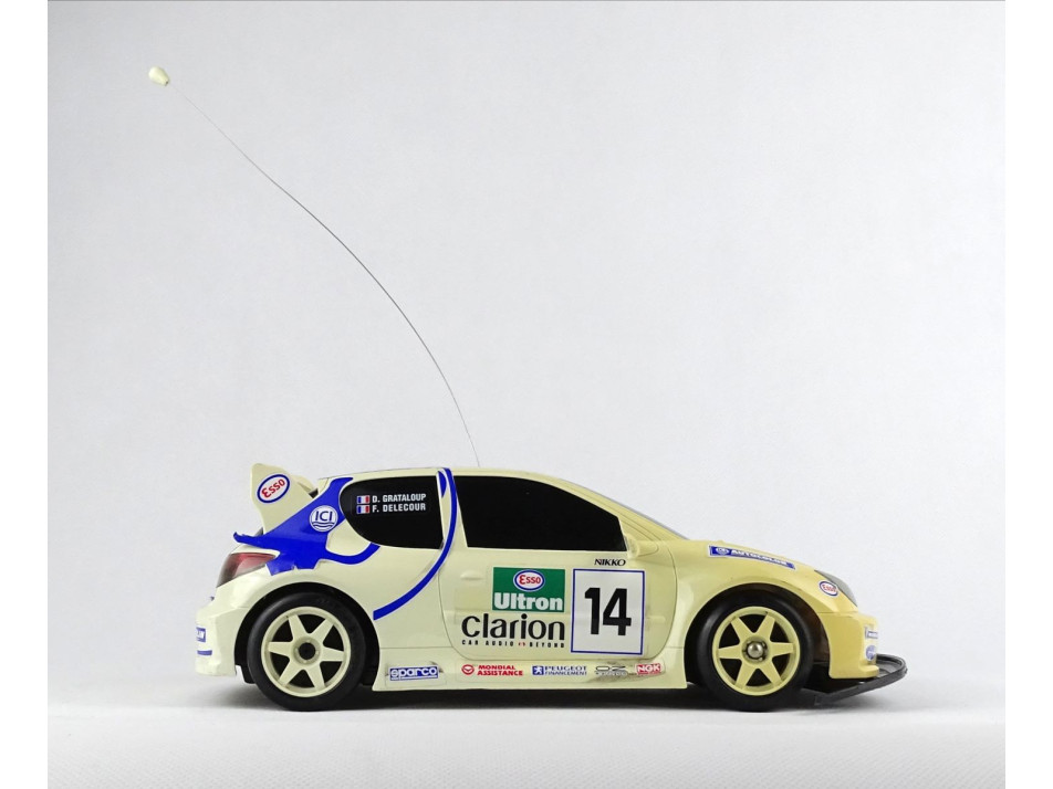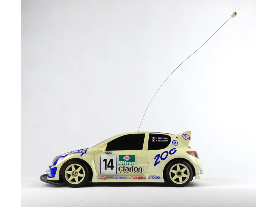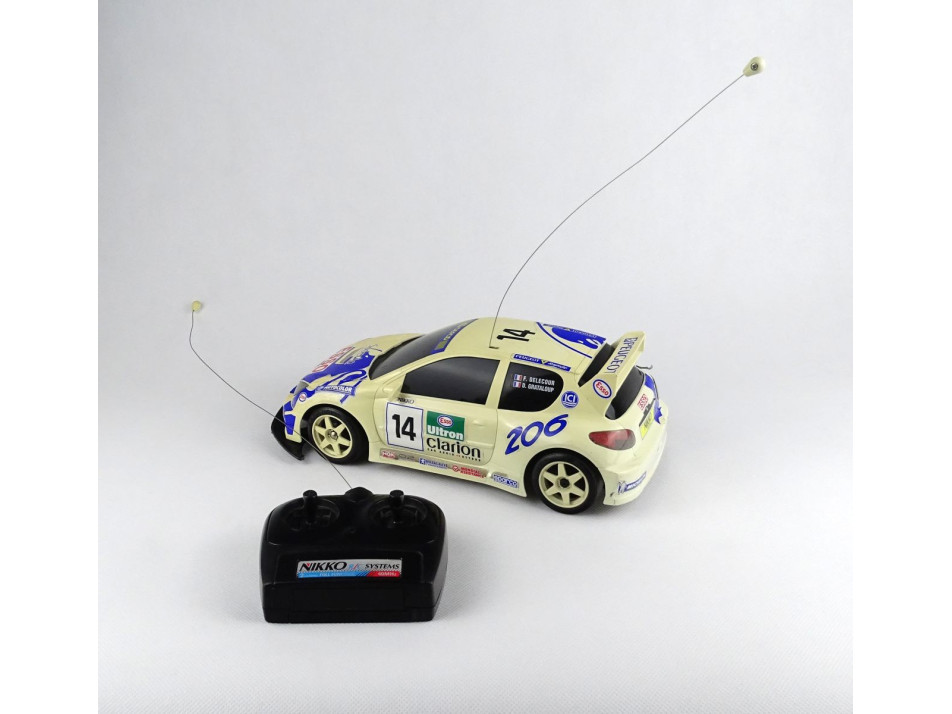 Szép állapotú távirányítós Nikko Peugeot 206 versenyautó. Kis karbantartást követően gyönyörűen működő retro gyerekjáték.
