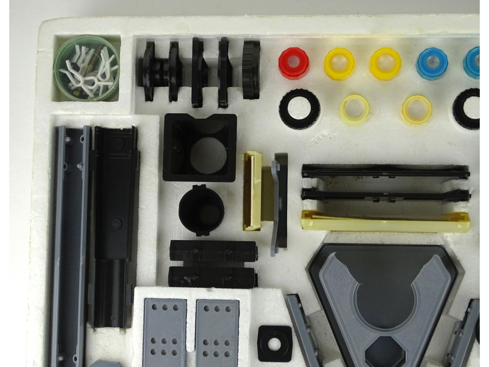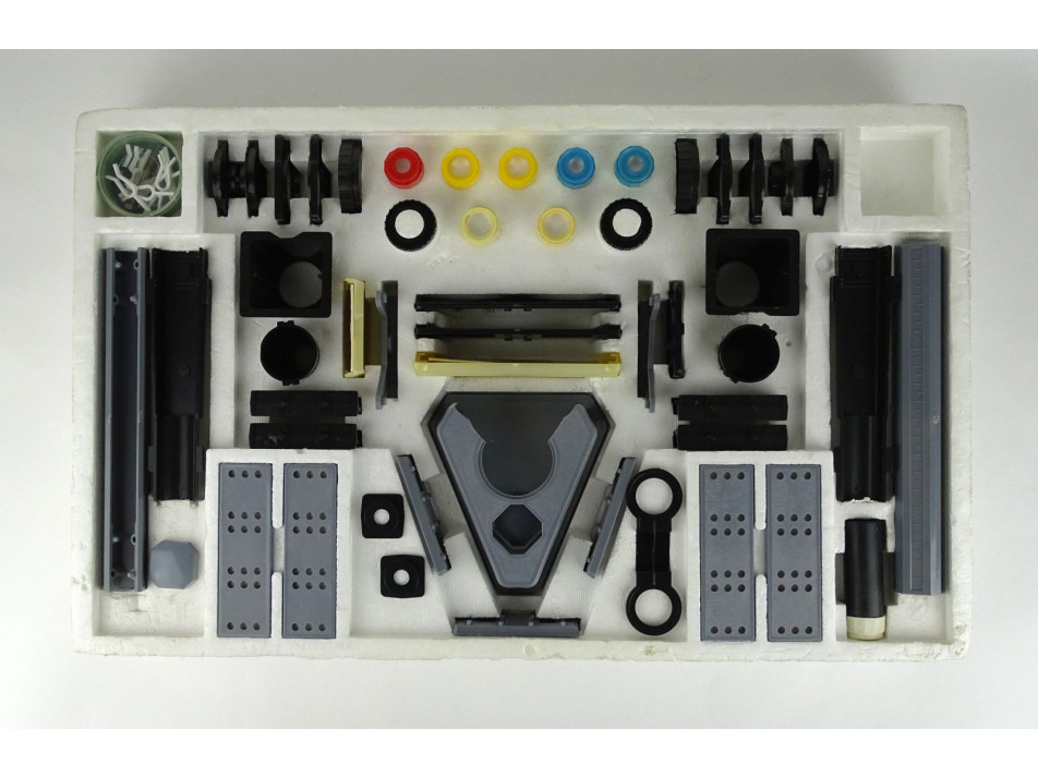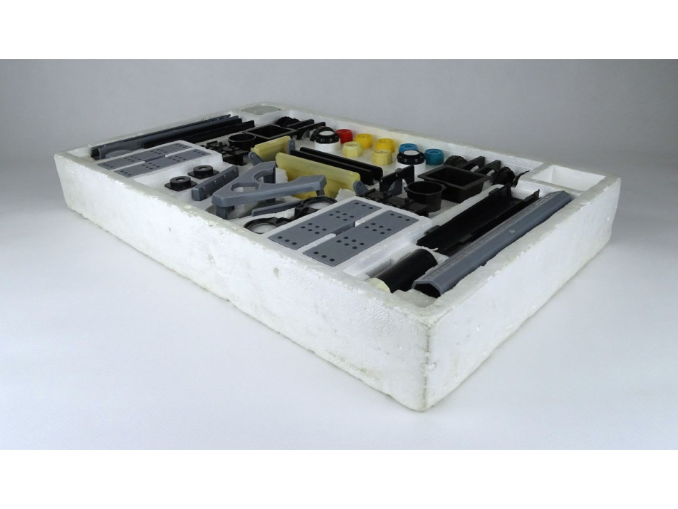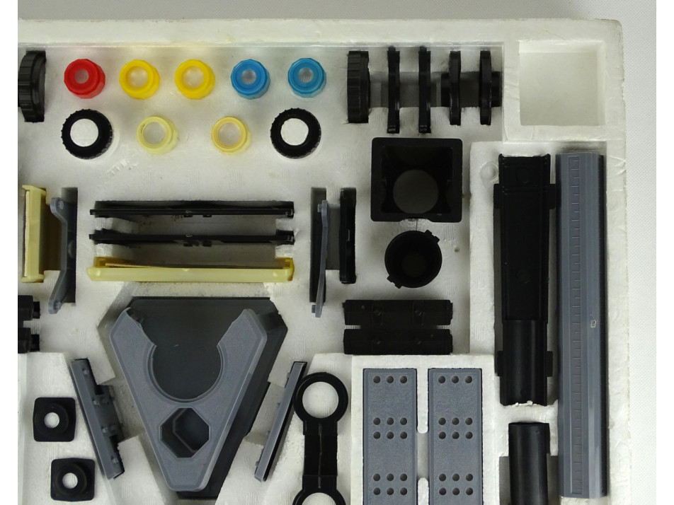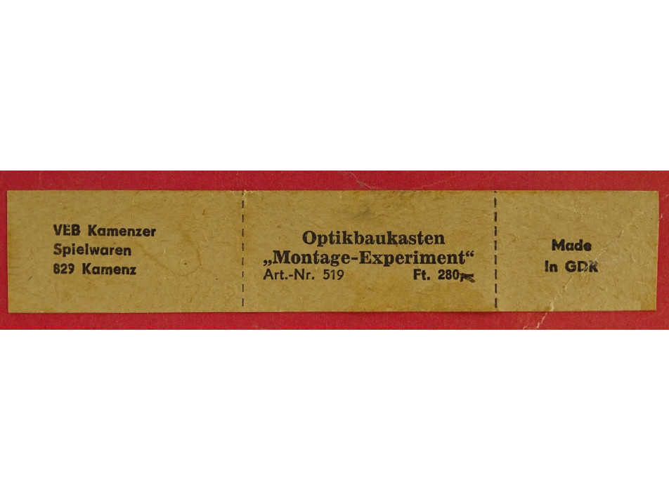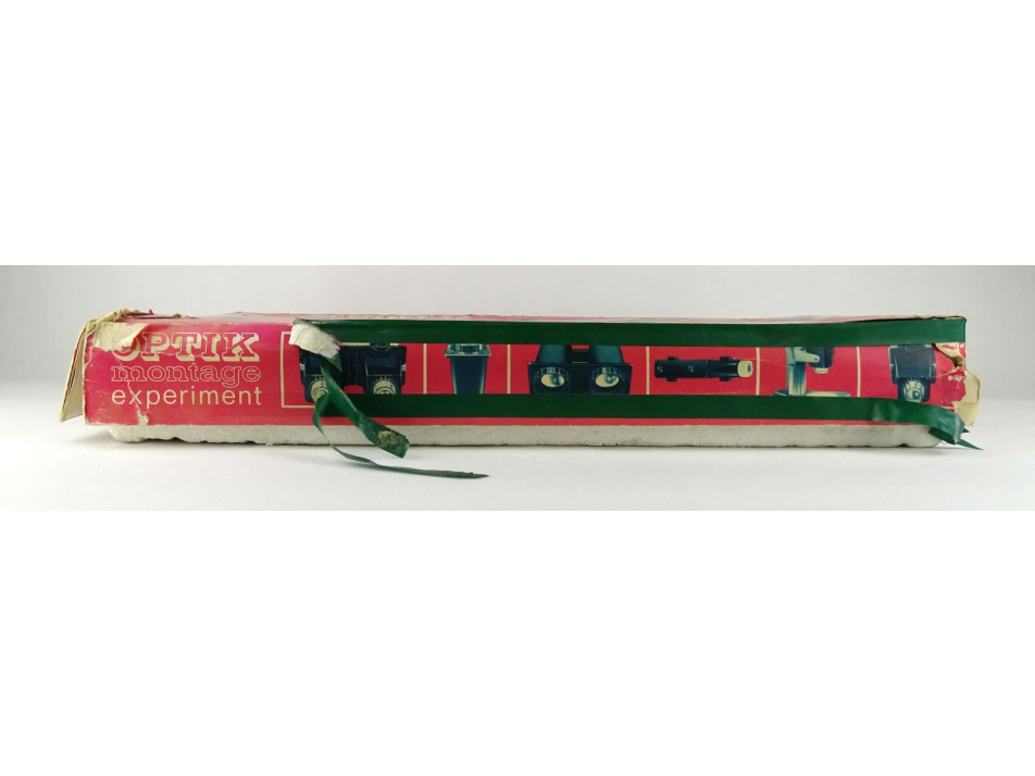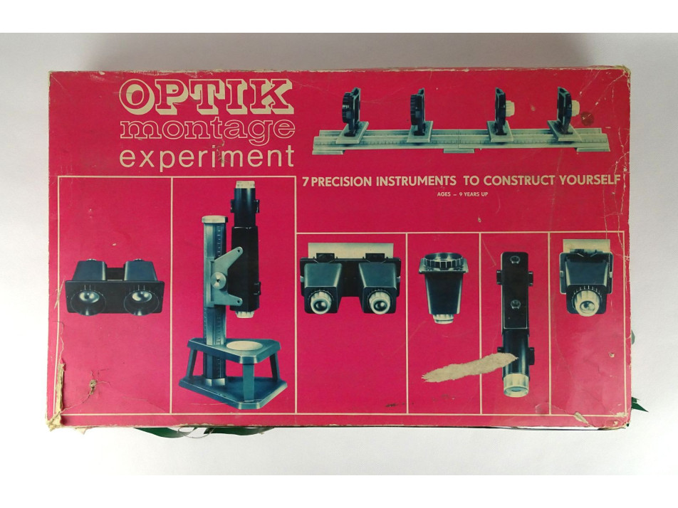 Retró Optik Montage Experiment készségfejlesztő játék eredeti dobozában. Műanyag elemei segítségével otthoni környezetben távcsövet, mikroszkópot vagy akár optikai padot is össze lehet állítani.