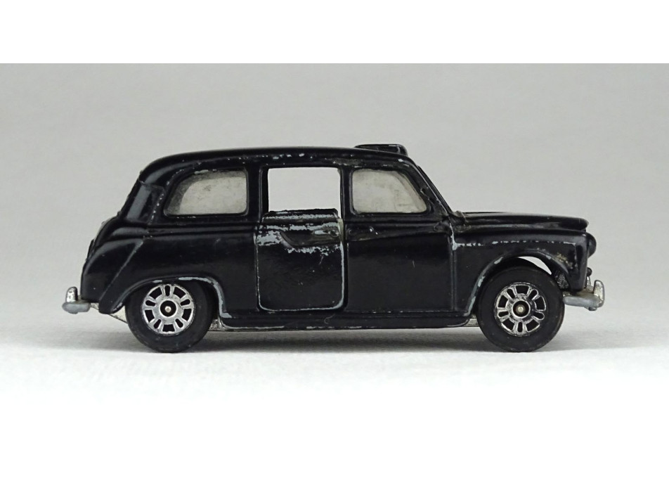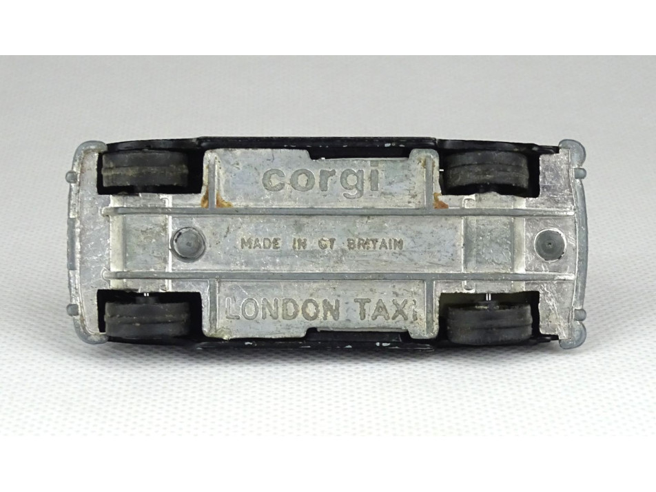 Ikonikus londoni fekete taxi. Ajtajai hátrafelé nyithatóak. Fotón látható, kissé kopottas állapotban. Feliratok: CORGI MADE IN GT. BRITAIN LONDON TAXI