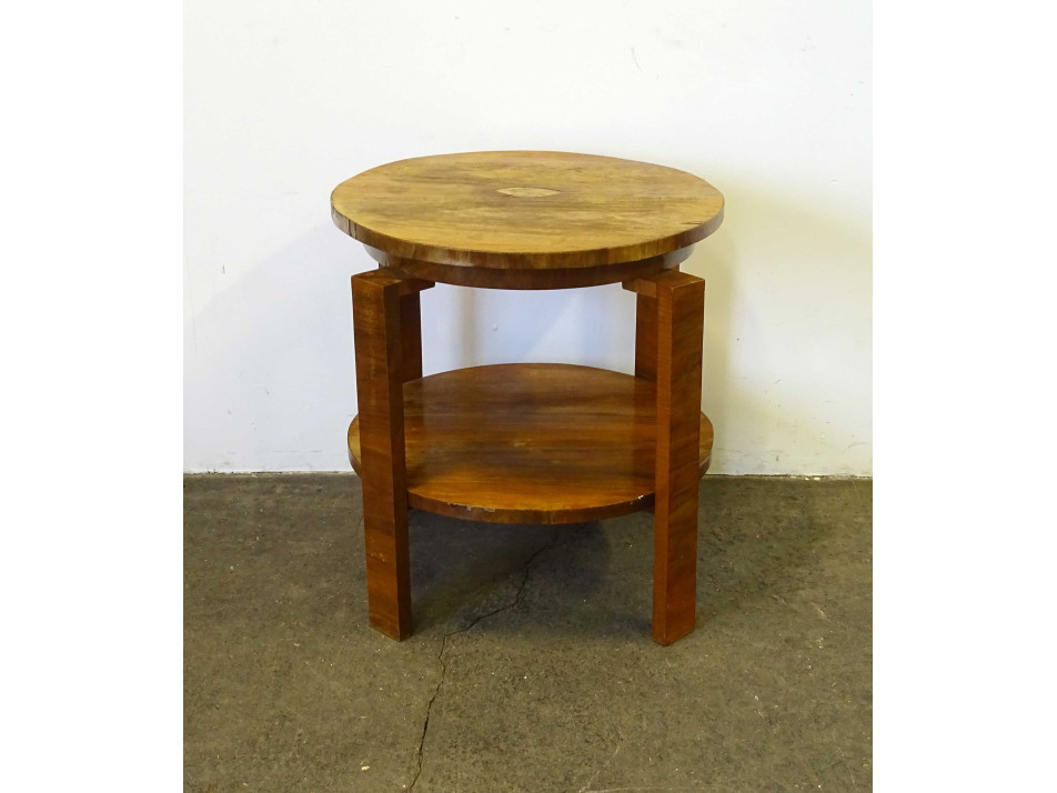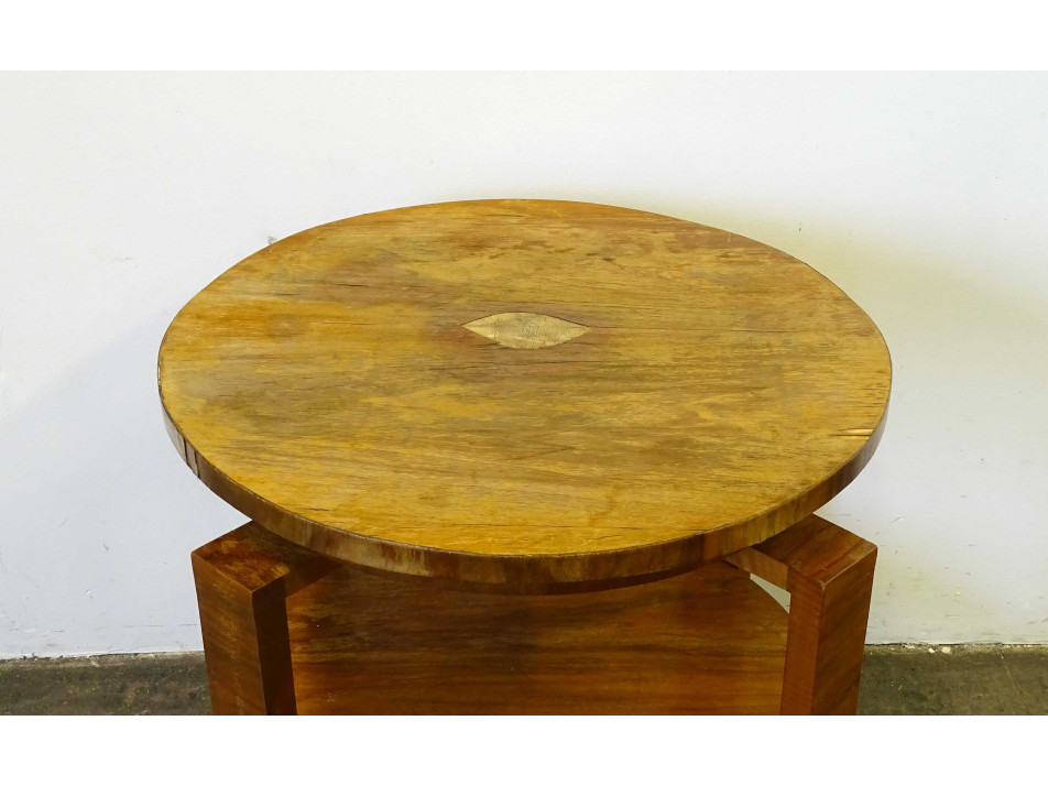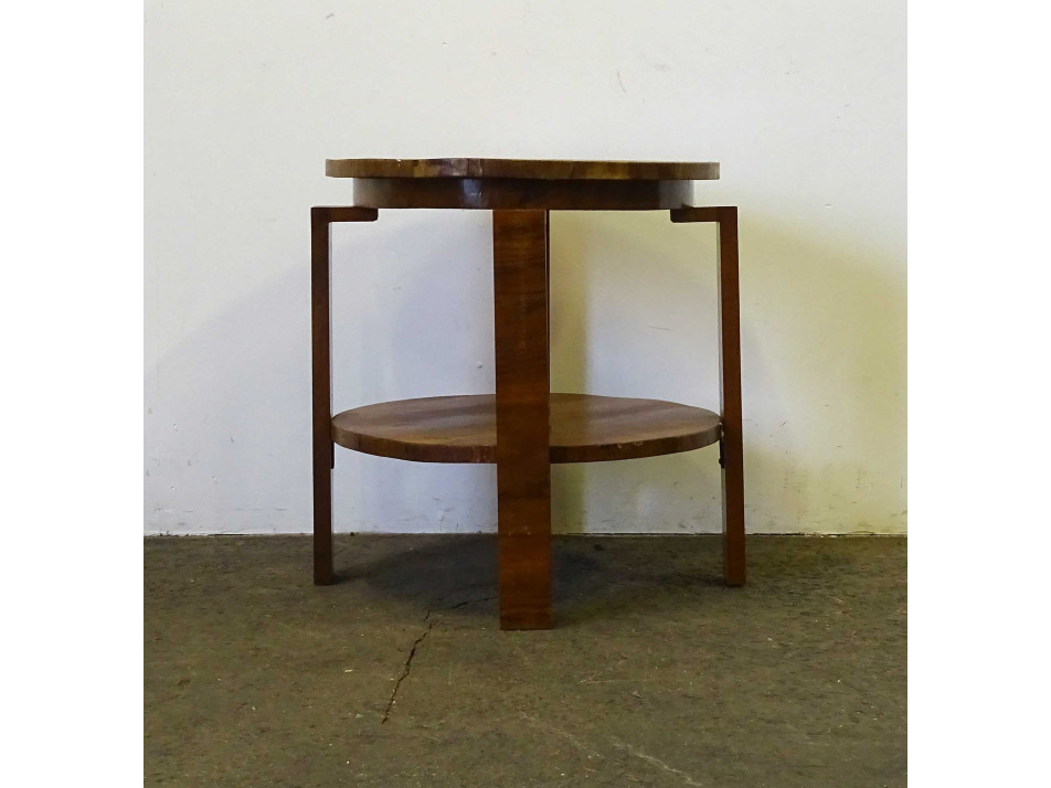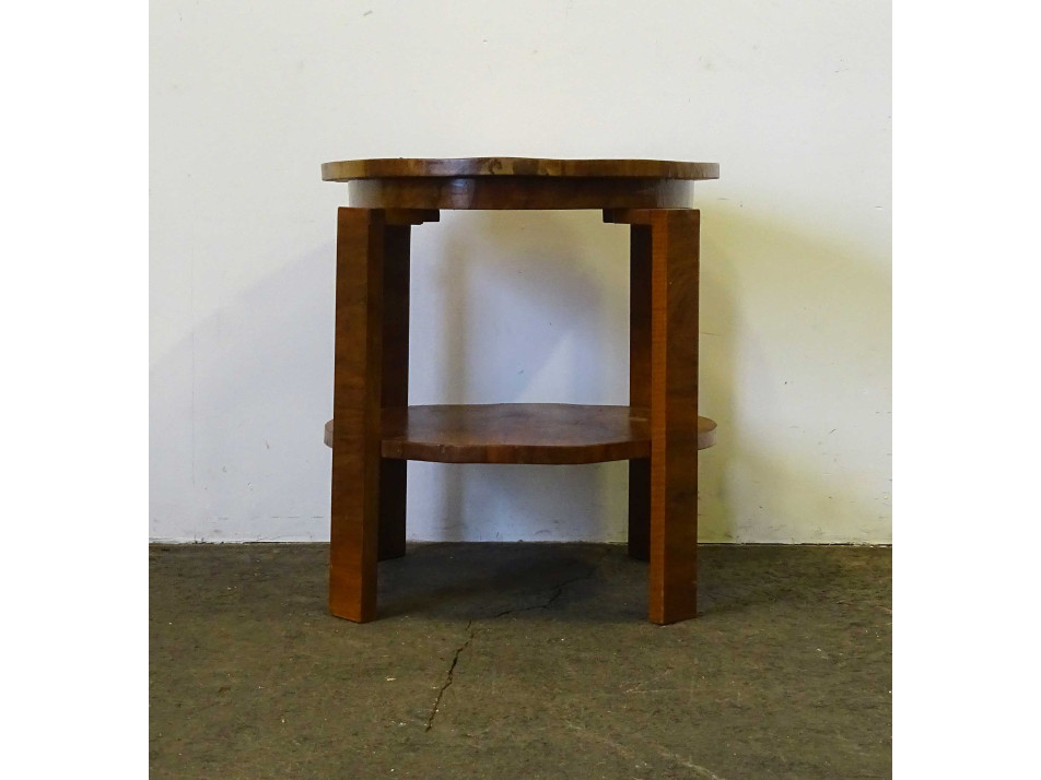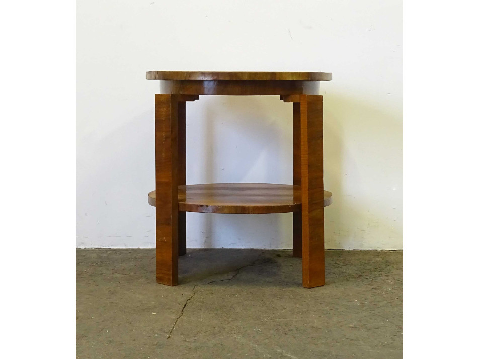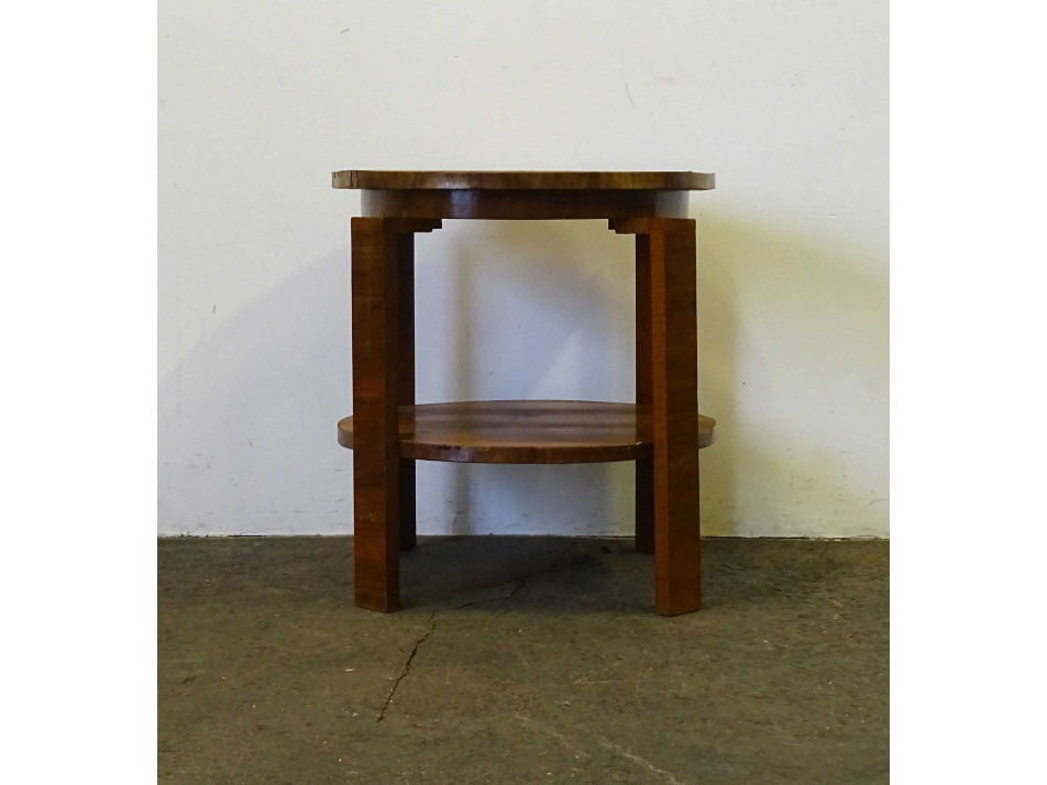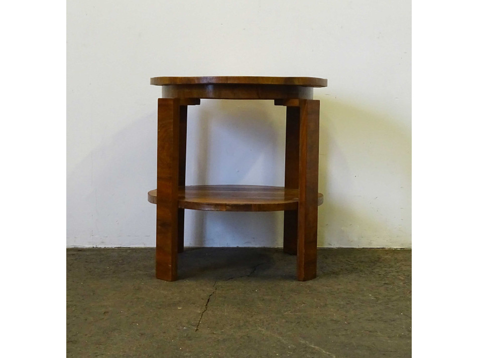 Régi, izgalmas formájú art deco körasztal, szalonasztal. Alsó polccal rendelkezik. Tetején furnér hiány látható.